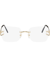 Square rimless metal-frame optical glasses. · Logo etched at lens · Adjustable rubber nose pads · Logo plaque at acetate temple tips · Includes case · Size: 57.17 145 Supplier color: Gold Metal, acetate. Made in France 252346F004010