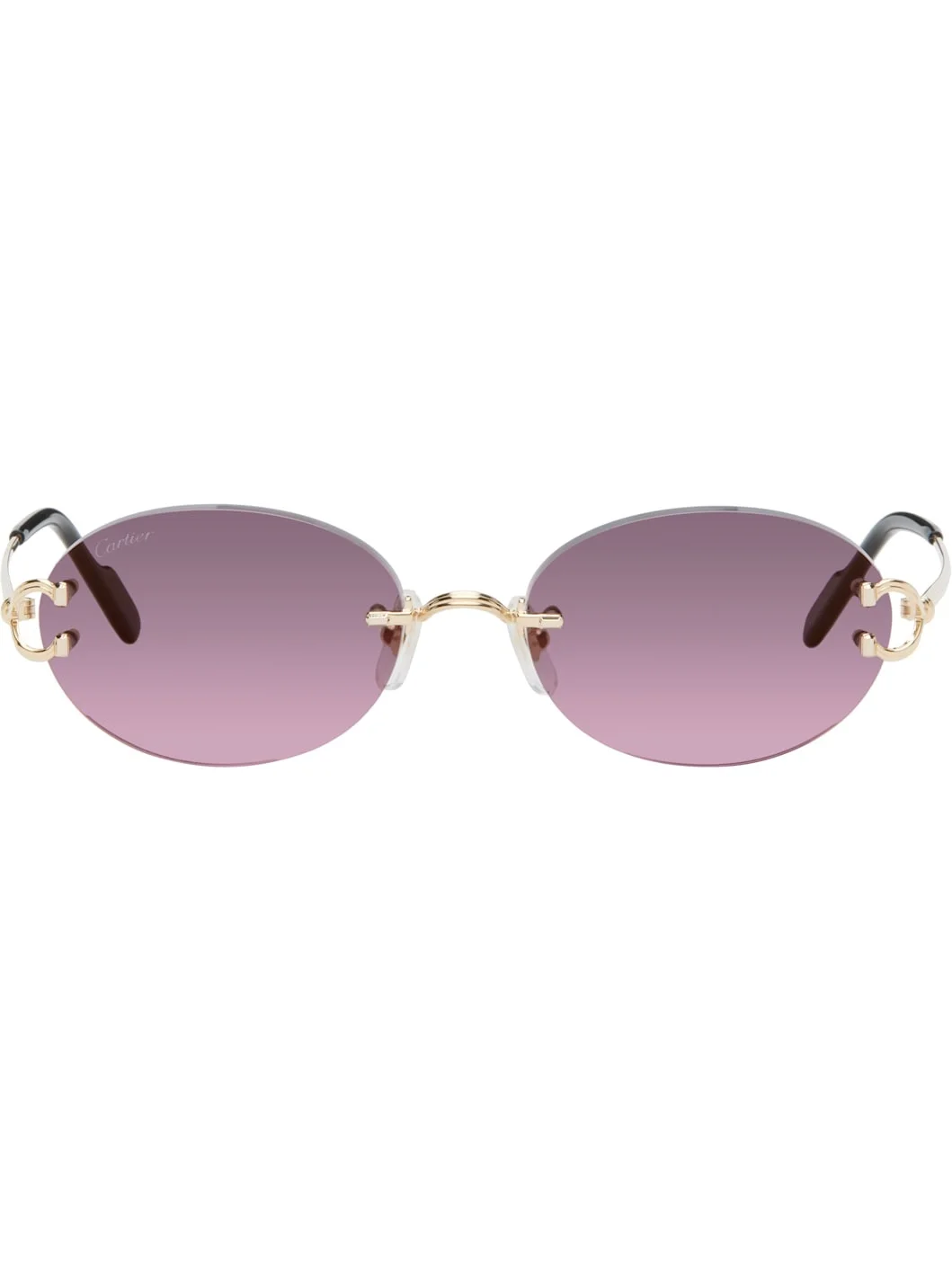 Oval rimless metal-frame sunglasses in gold tone. · Purple lenses · Logo etched at lens · 100% UVA/UVB protection, category 3 · Adjustable rubber nose pads · Logo hardware at temples · Logo plaque at black acetate temple tips · Includes case · Size: 55.18 140 Part of the Signature C de Cartier collection. Supplier color: Gold Metal, acetate. Made in France 252346F005000