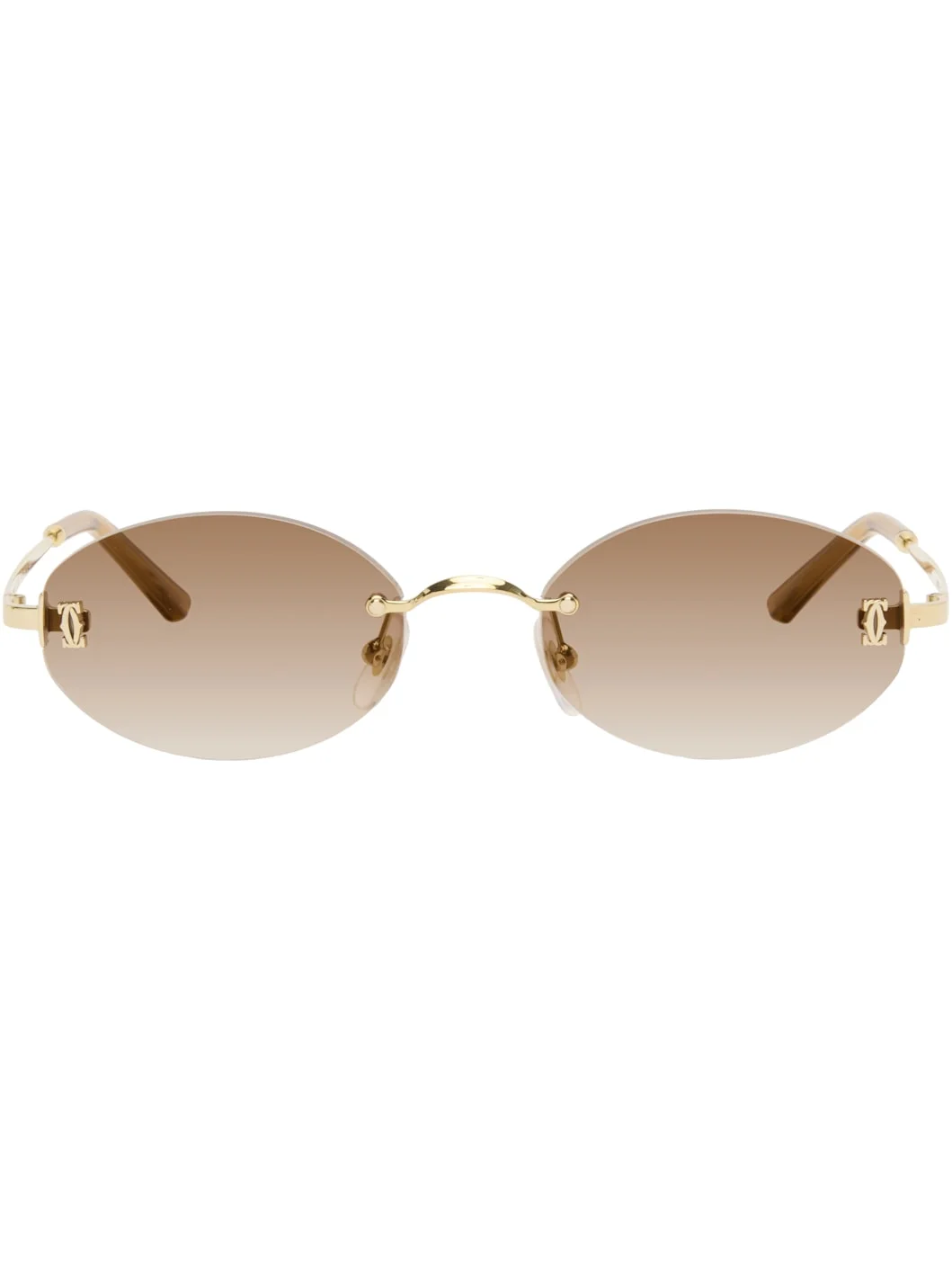 Oval rimless metal-frame sunglasses. · Brown gradient lenses · 100% UV protection, category 2 · Logo hardware at lenses · Adjustable rubber nose pads · Logo etched at temples · Transparent acetate temple tips · Includes case · Size: 55.20 140 Supplier color: Gold Metal. Made in France 261346F005001