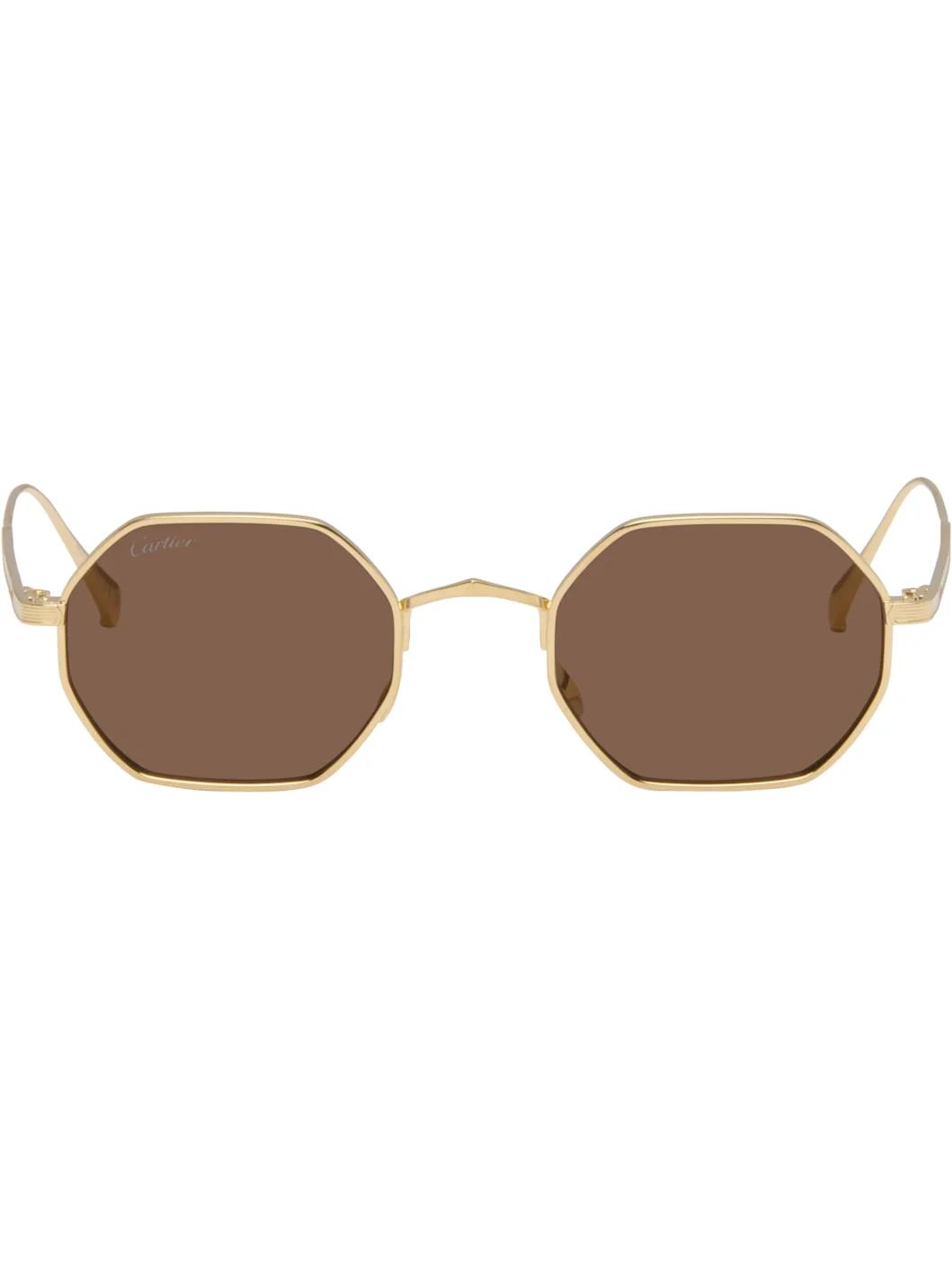 Hexagonal titanium-frame sunglasses. · Brown lenses · Logo etched at lens · Adjustable metal nose pads · Logo etched at temples · Includes case · Size: 48.22 145 Supplier color: Gold/Gold/Brown Titanium. Made in Japan 261346F005011