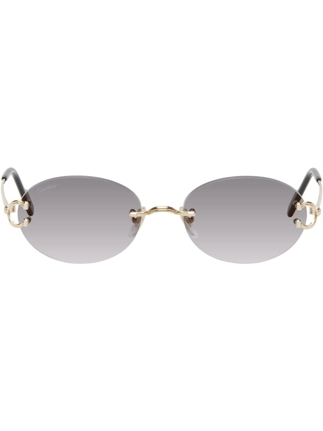 Round rimless metal-frame sunglasses in gold tone. · Gray gradient lenses · 100% UVA/UVB protection, category 2 · Logo etched at lens · Integrated nose pads · Logo hardware at hinges · Logo plaque at black acetate temple tips · Includes case · Size: 55.18 140 Part of the Decor C de Cartier collection. Supplier color: Gold Metal, acetate. Made in France 252346F005002