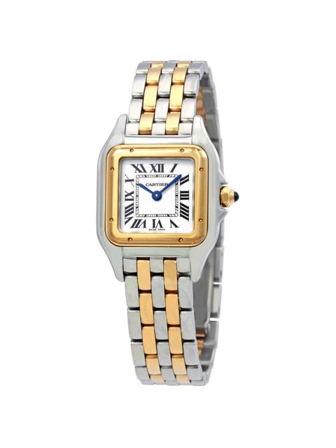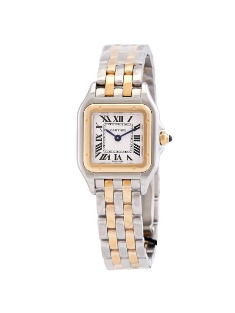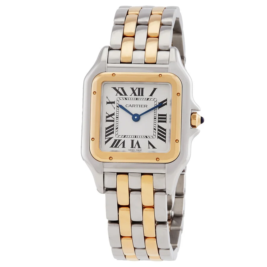 Stainless steel case with a stainless steel bracelet with 18kt yellow gold links. Fixed stainless steel and 18kt yellow gold bezel. Silver dial with blue hands and Roman numeral hour markers. Minute markers around an inner ring. Dial Type: Analog. Quartz movement. Scratch resistant sapphire crystal. Pull / push crown. Solid case back. Square case shape. Case dimensions: 29 mm x 37 mm. Case thickness: 6 mm. Hidden fold over clasp. Water resistant at 30 meters / 100 feet. Functions: hour, minute. Luxury watch style. Watch label: Swiss Made. Cartier Panthere Silver Dial Ladies Watch W2PN0007. INFORMATION Brand: Cartier Series: Panthere Collection Name: Panthere Gender: Womens Model: W2PN0007 Watch Label: Swiss Made Movement: Quartz CASE Case Size: 29 mm x 37 mm Case Thickness: 6 mm Case Material: Stainless Steel Case Shape: Square Case Back: Solid BAND Band Material: Stainless Steel and 18kt Yellow Gold Band Type: Bracelet Band Color: Two-tone (Silver-tone and Gold-tone) Clasp: Hidden Fold Over DIAL Dial Color: Silver Type: Analog Crystal: Scratch Resistant Sapphire Hands: Blued-steel Sword-shaped Dial Markers: Roman Numeral Second Markers: Minute Markers around an inner ring Bezel: Fixed Bezel Color: Silver-tone Bezel Material: Stainless Steel and 18kt Yellow Gold Crown: Pull / Push FEATURES Water Resistance: 30 meters / 100 feet Functions: Hour, Minute Watch Features: Stainless Steel, Gold, Analog ADDITIONAL INFO Watch Style: Luxury Warranty: 2 Year Jomashop Warranty UPC Code: 7613268812662 Jomashop Sku: CRTW2PN0007 Department: Watches Category: Watches