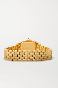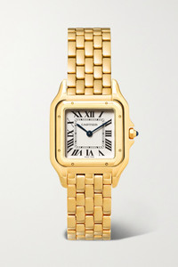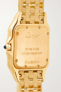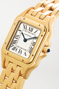 EDITORS'NOTES Cartier's 'Panthère de Cartier' watch is as refined and unforgettable as a treasured piece of fine jewelry. Defined by rounded corners and soft, clean lines, this 18-karat gold design has a silvered face with blued steel sword-shaped hands, all encased in sapphire glass. The octagonal crown is dotted with a bright sapphire. <br><br><i>For warranty information, please refer to details & care</i> SIZE & FIT This item's measurements are: - Circumference: 16.5cm / 6.5in - Width: 1.5cm / 0.6in DETAILS & CARE - Movement - Quartz movement Functions - Hour and minute hands Dial - Silvered dial - Black Roman numerals and markers, blued steel sword-shaped hands Case - 18-karat gold case - Crown for time adjustments and manual winding - Sapphire glass crystal Bracelet - 18-karat gold bracelet - Invisible clasp fastening Specifications - Case width: 27mm; case height: 37mm - Water resistance: 3 bar - Comes in a presentation box - Reference number: WGPN0009 - Manufactured in Switzerland Cartier creations are manufactured with the greatest care by Cartier workshops in the purest tradition of jewelry and watchmaking, thus giving each piece a unique character. As a result, information on the carat weights in relation to a model may vary slightly from one piece to another and are therefore given for information only. All Cartier watches still within the initial 2-year warranty period under the original International Limited Warranty will be eligible to benefit from a 6-year extension, for a total of 8 years warranty.