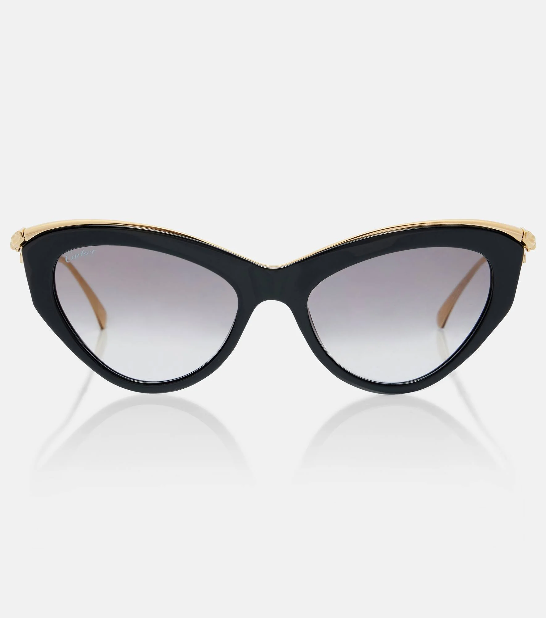 From Cartier Eyewear Collection Panthere de Cartier line, these sunglasses channel the enigmatic cat – a symbol of the brand since 1914. These sunglasses boast metal hardware and cat-eye frames. Product Details - Frame material: acetate, metal - Frame color: black, gold - Lens filter category 2 - Lens color: grey - Made in Italy - Includes: case, cleaning cloth - The color of the case may vary - Item number: P01100153 Size & Fit - Lens width: 53mm-2.1" - Bridge size: 18mm-0.7" - Earpiece length: 140mm-5.5"