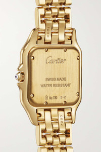 EDITORS'NOTES There's a rich history attached to every Cartier timepiece. The unforgettable character of Cartier's 'Panthère de Cartier' watch led to its recent relaunch. Just like the original that debuted in the '80s, this iteration is cast from 18-karat gold and defined by a distinctive octagonal crown with sleek rounded edges. Its classic white dial is framed by individually placed diamonds, mapped with signature Roman numerals and blue sword-shaped hands. Reserve yours for glamorous events. For warranty information, please refer to details & care SIZE & FIT This item’s measurements are: - Circumference: 20cm / 7.9in DETAILS & CARE - Movement - Quartz movement Functions - Hour and minute hands Dial - Silvered dial - Black Roman numerals and markers, blued steel sword-shaped hands Case - 18-karat gold case - Brilliant-cut G diamonds, total weight: 0.345-carats Bracelet - 18-karat gold bracelet - Invisible clasp fastening Specifications - Case width: 27mm; case thickness: 6mm - Water resistance: 3 bar - Comes in a presentation box - Reference number: CRWJPN0016 Cartier creations are manufactured with the greatest care by Cartier workshops in the purest tradition of jewelry and watchmaking, thus giving each piece a unique character. As a result, information on the carat weights in relation to a model may vary slightly from one piece to another and are therefore given for information only. All Cartier watches still within the initial 2-year warranty period under the original International Limited Warranty will be eligible to benefit from a 6-year extension, for a total of 8 years warranty.