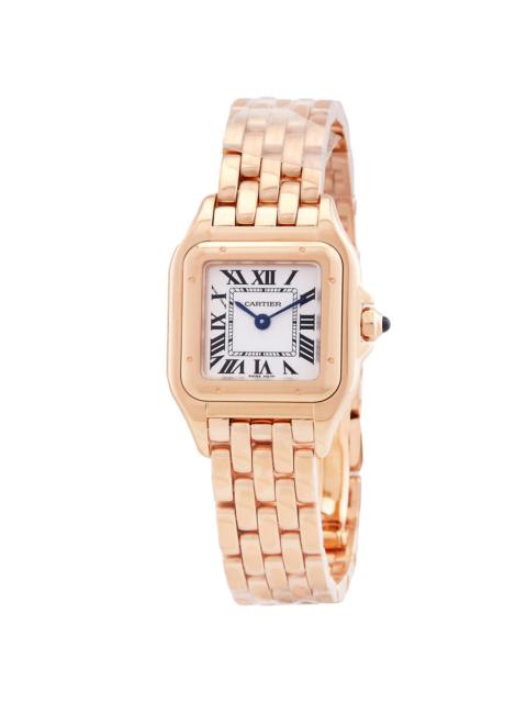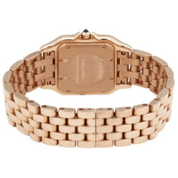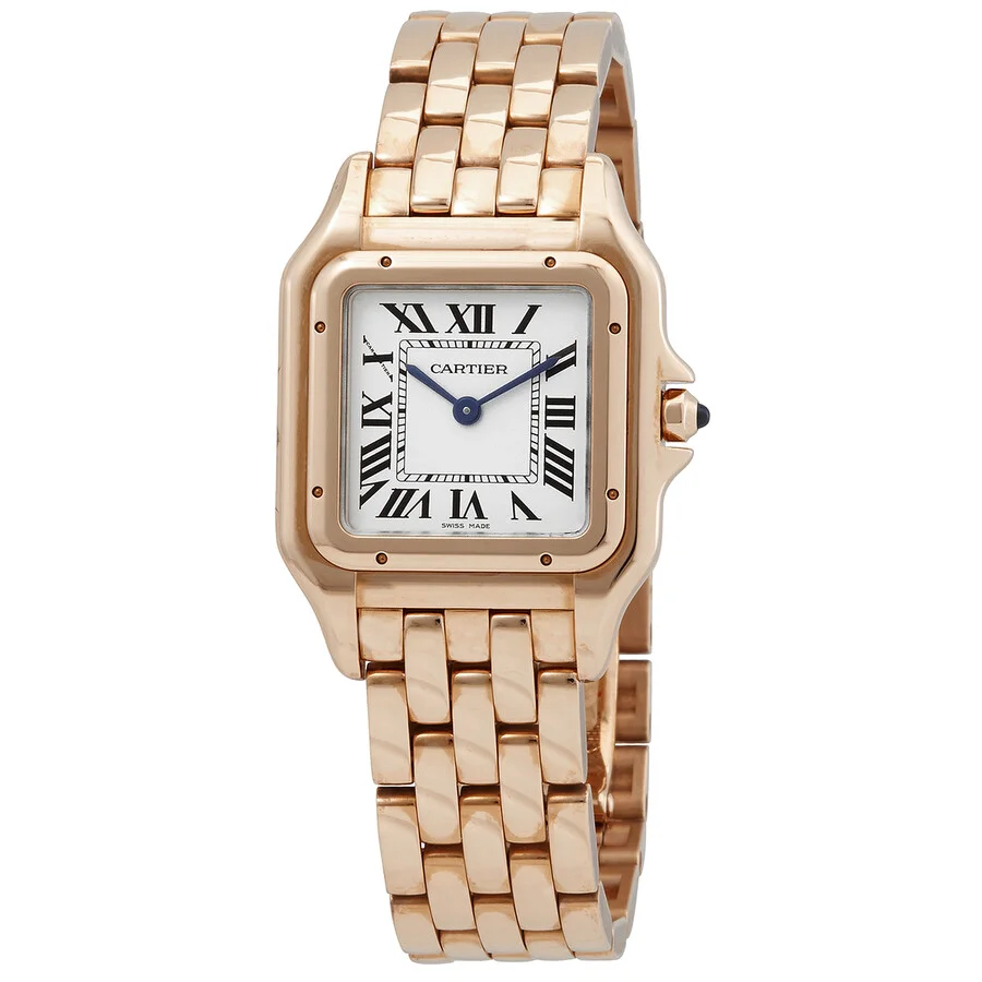 Pre-owned 18kt pink gold case with a 18kt pink gold bracelet. Fixed 18kt pink gold bezel. Silver dial with blued-steel sword-shaped hands and Roman numeral hour markers. Minute markers around an inner ring. Dial Type: Analog. Quartz movement. Scratch resistant sapphire crystal. Pull / push crown set with a synthetic blue spinel cabochon. Solid case back. Square case shape. Case dimensions: 27 mm x 37 mm. Case thickness: 6 mm. Hidden fold over clasp. Water resistant at 30 meters / 100 feet. Functions: hour, minute. Panthere De Cartier Series. Luxury watch style. Watch label: Swiss Made. Cartier Panthere de Cartier Silver Dial 18kt Pink Gold Ladies Watch WGPN0007. GENERAL Collection Name: Panthere De Cartier INFORMATION Brand: Cartier Series: Panthere Model: WGPN0007 Gender: Womens Watch Label: Swiss Made Movement: Quartz CONDITION INFORMATION Box: Yes Preowned Item Condition: Excellent Papers: No CASE Case Diameter: 37 Case Thickness: 6 mm Case Material: 18kt Pink Gold Case Shape: Square Case Back: Solid DIAL Type: Analog Dial Color: Silver Crystal: Scratch Resistant Sapphire Hands: Blued-steel Sword-shaped Second Markers: Minute Markers around an inner ring Dial Markers: Roman Numeral Bezel: Fixed Bezel Color: Rose Gold-tone Bezel Material: 18kt Pink Gold Crown: Pull / Push BAND Band Type: Bracelet Band Material: 18kt Pink Gold Band Color: Rose Gold-tone Clasp: Hidden Fold Over FEATURES Water Resistance: 30 meters / 100 feet Functions: Hour, Minute Watch Features: Gold, Analog ADDITIONAL INFO Watch Style: Luxury Warranty: 1 Year Jomashop Warranty UPC Code: 7613268812501 Jomashop Sku: PRE-P-CRT98130 Department: Watches
