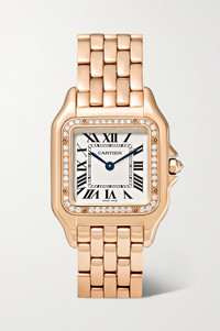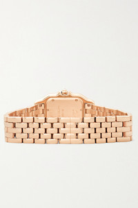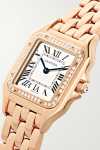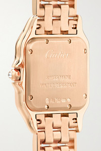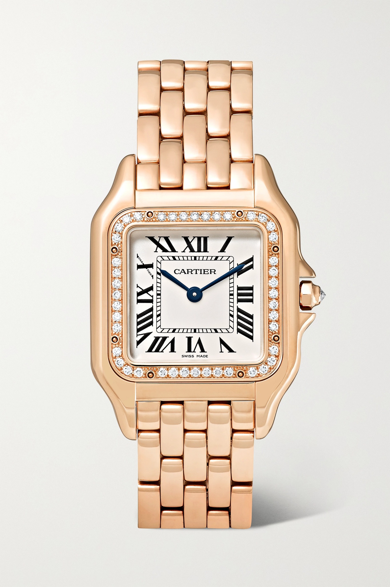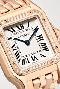 EDITORS'NOTES Originally launched in 1983, Cartier's iconic 'Panthère' watch collection is named because its elegant links mimic the movement of a panther as it slinks through the jungle. Recently revived after a 13-year hiatus, this timeless style has been expertly crafted in Switzerland from 18-karat pink gold with the same square dial as the original. It has a signature interlocking bracelet that’s strong and flexible and is finished with a glistening diamond-set bezel.<br><br><i>For warranty information, please refer to details & care</i> SIZE & FIT This item’s measurements are: - Circumference: 16cm / 6.3in DETAILS & CARE - Movement - Quartz movement Functions - Hour and minute hands Dial - Silvered dial - Black Roman numerals and markers, blued steel sword-shaped hands Case - 18-karat pink gold case - Brilliant-cut F-G diamonds, total weight: 0.31-carats Bracelet -18-karat pink gold bracelet - Invisible clasp fastening Specifications - Case width: 27mm; case height: 37mm; case thickness: 6mm - Water resistance: 3 bar - Comes in a presentation box - Reference number: WJPN0009 - Manufactured in Switzerland Cartier creations are manufactured with the greatest care by Cartier workshops in the purest tradition of jewelry and watchmaking, thus giving each piece a unique character. As a result, information on the carat weights in relation to a model may vary slightly from one piece to another and are therefore given for information only. All Cartier watches still within the initial 2-year warranty period under the original International Limited Warranty will be eligible to benefit from a 6-year extension, for a total of 8 years warranty.