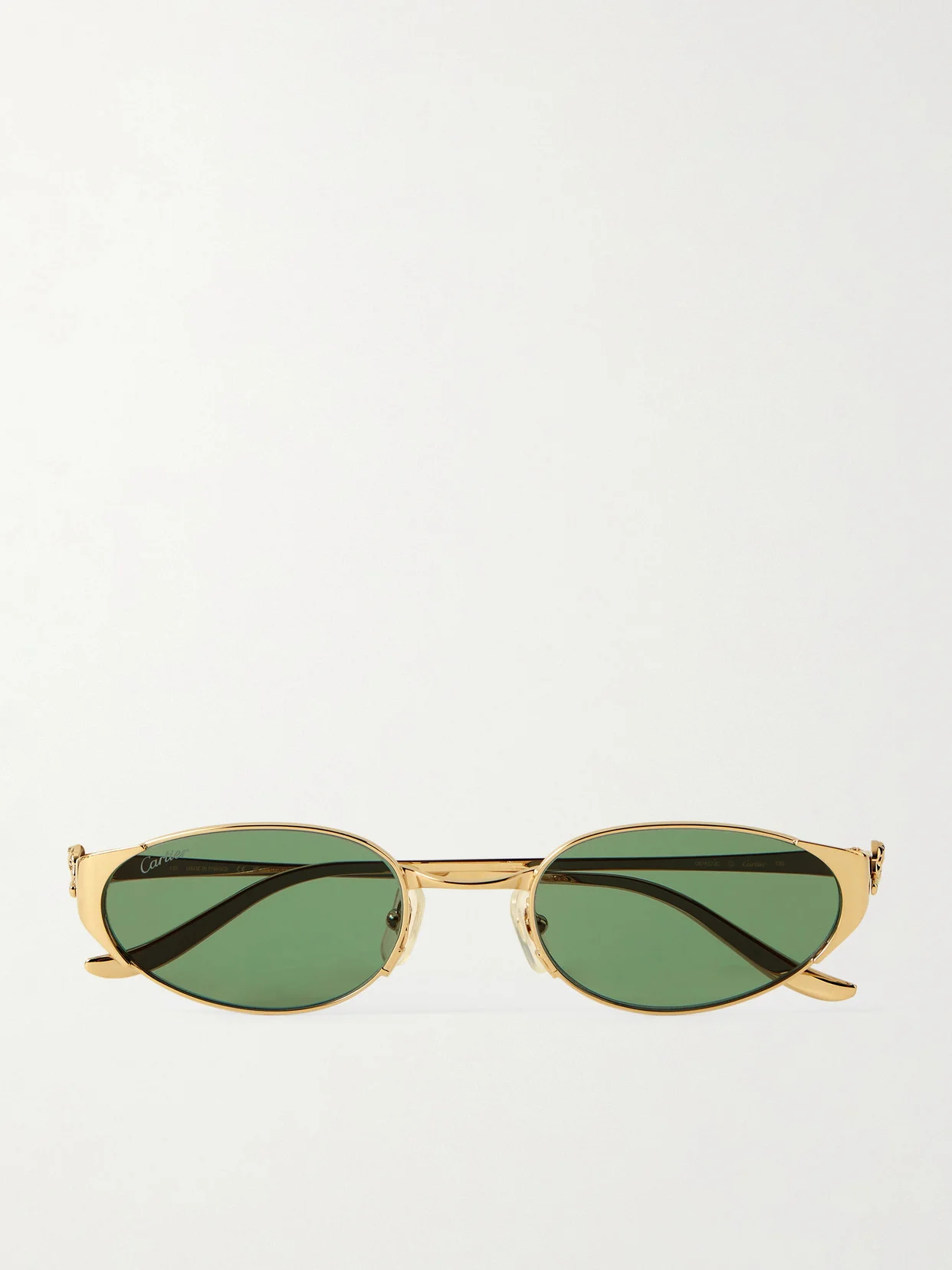 Made from gold-tone metal, Cartier Eyewear's sunglasses are almost like jewelry - the signature panther leaps from each arm. They have oval-shaped, green lenses etched with a subtle logo.