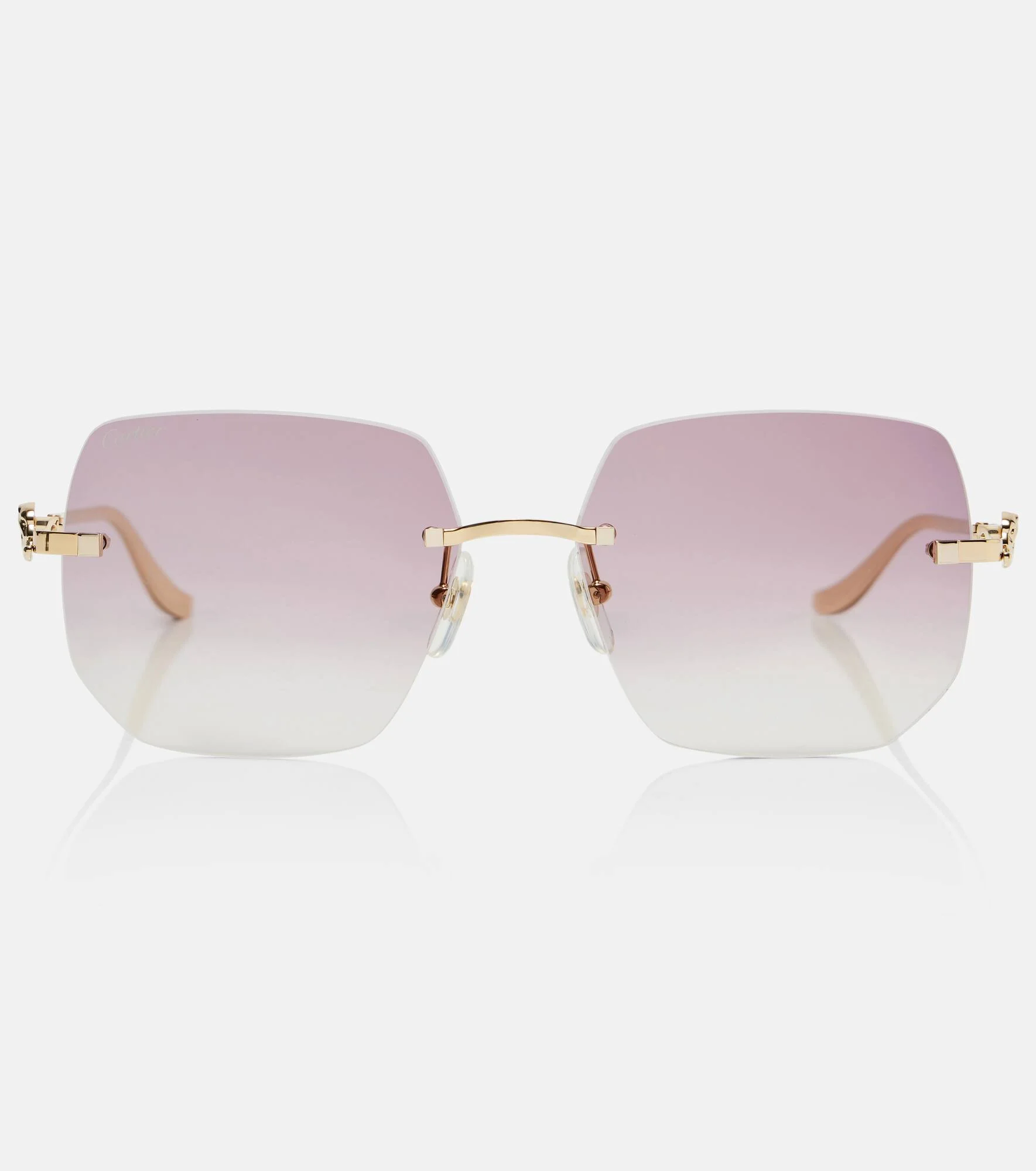Designed with a golden metal frame, the Panthere De Cartier sunglasses from Cartier Eyewear Collection offer a sophisticated look. Shaped with square lenses, the pair features the brand's signature on the temples and comes with a logo-embossed case. Product Details - Frame material: metal - Frame color: gold - Lens filter category 2 - Lens color: violet - Made in France - Includes: logo-embossed hard case , cleaning cloth - The color of the case may vary - Item number: P01015729 Size & Fit - Lens width: 55mm-2.15" - Bridge size: 15mm-0.6" - Earpiece length: 145mm-5.7"