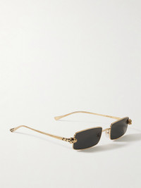 A closer look at Cartier Eyewear's 'Panthere' sunglasses reveals they're made with the same refinement and attention to detail as the label's renowned jewelry. This rectangle-frame pair is made from gold-tone metal decorated with the signature panther heads at the temple - notice the meticulous placement of the enamel spots and the green crystal eyes.