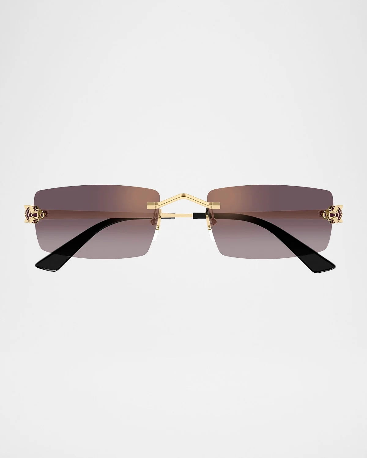 Celebrate the untameable elegance of the panther with the Cartier "CT0598S002" metal sunglasses from the Panthere de Cartier Collection, featuring the enameled panther icon at the end pieces. Lens/bridge/temple (in mm): 5520145 Rimless rectangle frames Mirrored gradient lenses Angular bridge Adjustable nose pads Thin, tapered arms with engraved logo script on the temples Capped temple tips in acetate 100% UVA/UVB protection Made in France