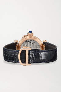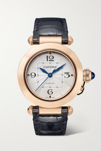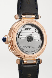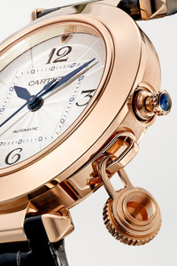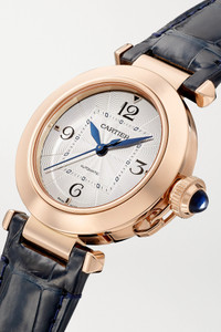 EDITORS'NOTES Cartier's 'Pasha de Cartier' timepiece was first launched in the '80s and inspired by a wristwatch the brand introduced to its collection in 1943. A modern-day take on the 1985 model, this exquisite timepiece has an 18-karat rose gold case that houses a silvered guilloché dial adorned with Arabic numerals. It's powered by a Swiss-made calibre automatic 1847 MC movement for precise time-keeping and has an exhibition case back, so you can see its intricate inner workings. Match the interchangeable alligator straps to your suiting. All Cartier watches still within the initial 2-year warranty period under the original International Limited Warranty will be eligible to benefit from a 6-year extension, for a total of 8 years warranty. SIZE & FIT This item’s measurements are: - Circumference: 19cm / 7.5in DETAILS & CARE - Movement - Swiss-made calibre 1847 MC automatic movement with 40-hour power reserve - 23 jewels Functions - Hour, minute and second hands Dial - Silvered gradient guilloché dial - Black Arabic numerals, blued steel diamond-shaped hands Case - 18-karat rose gold case - Crown for time adjustments and manual winding - Exhibition case back - Buckle-fastening navy alligator strap; additional gray alligator strap Specifications - Case width: 35mm; case thickness: 9.37mm - Water resistance: 10 bar - Comes in a presentation box - Alligator: USA - Reference number: WGPA0014 - Manufactured in Switzerland Cartier creations are manufactured with the greatest care by Cartier workshops in the purest tradition of jewelry and watchmaking, thus giving each piece a unique character. As a result, information on the carat weights in relation to a model may vary slightly from one piece to another and are therefore given for information only.