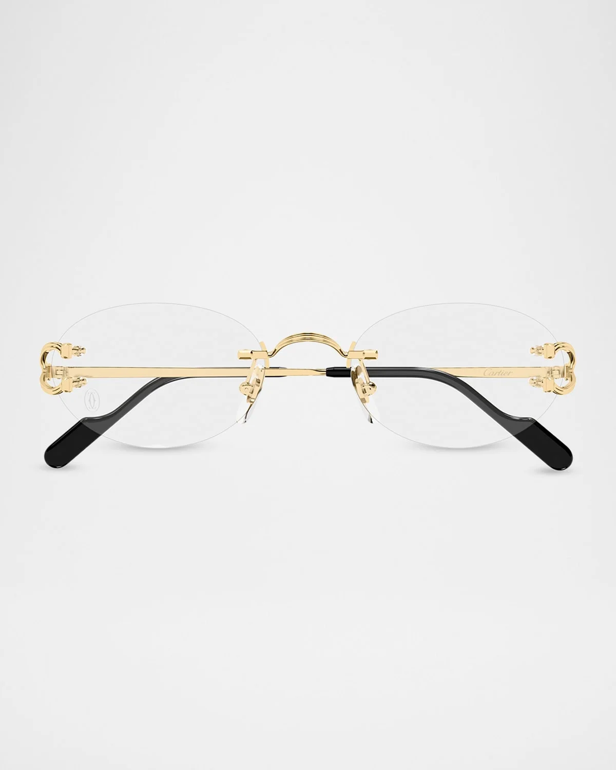 Cartier "CT0621O" oval optical frames feature a rimless, curved silhouette. Eye/bridge/temple (in mm): 52-20-140 Clear & nbsp;demo lens intended for prescription use Adjustable nose pads iconic C & nbsp;decor hinges Acetate tips for comfort Metal Made in France