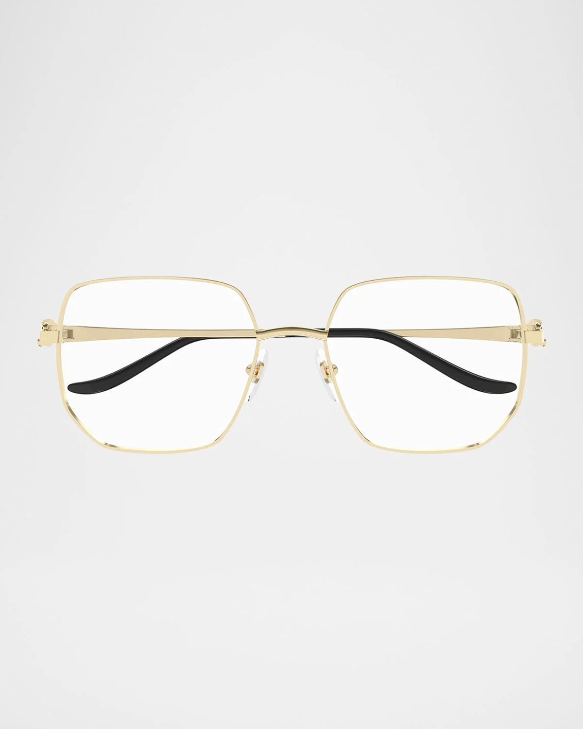 - Cartier rectangle glasses in metal - Eye/bridge/temple (in mm): 55-18-135 - Adjustable nose pads - Clear, non-optical lenses (replacement recommended) - Signature engraved logo at temples - Thin arms; curved, capped temple tips - Metal - Made in France - Proposition 65 warning for California residents