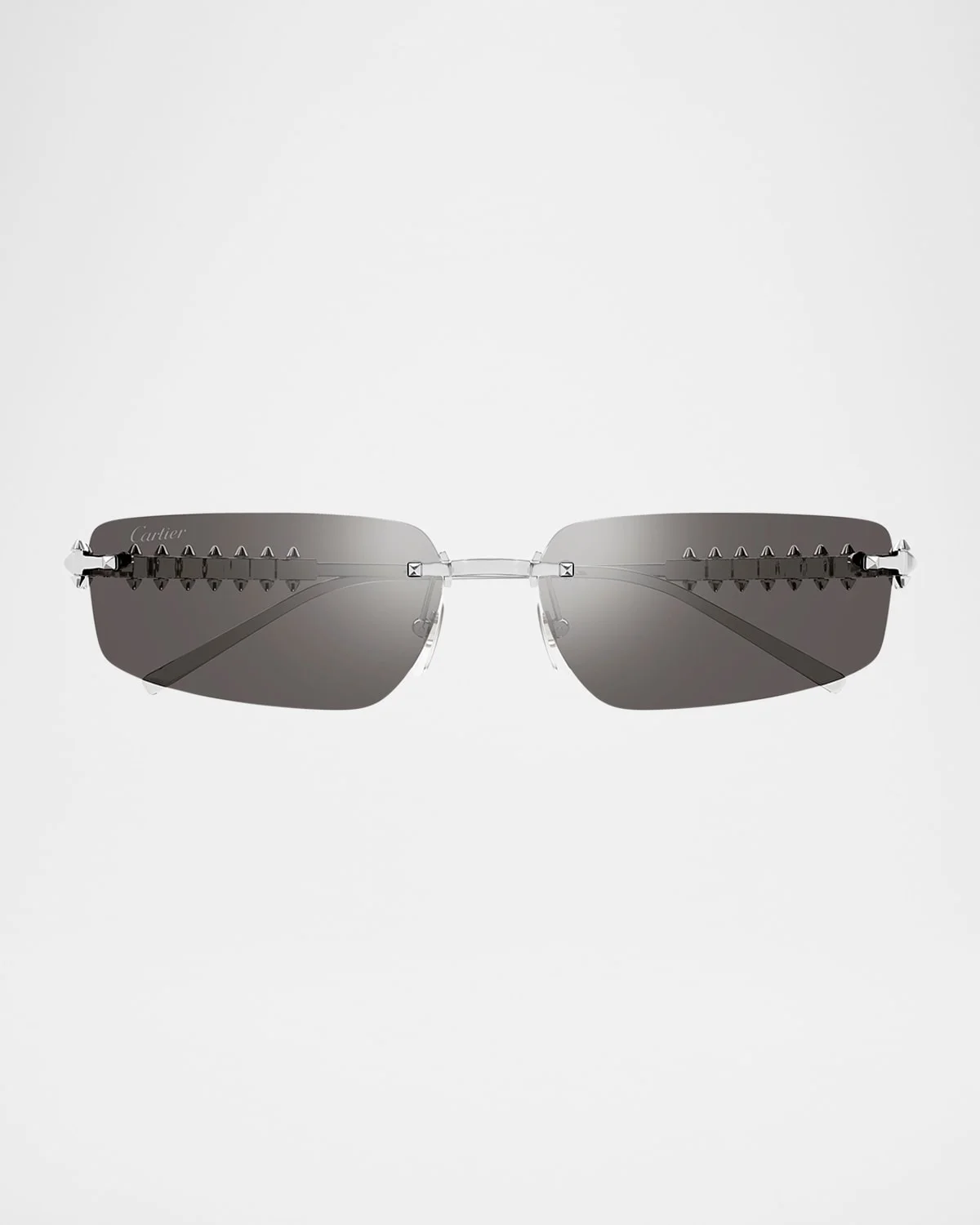 - Cartier "CT0544S" rectangle sunglasses in metal - Eye/bridge/temple (in mm): 58-16-140 - Rimless lenses; right logo script - Adjustable nose pads - Studding at temples - Thin, tapered arms - 100% UVA/UVB protection - Made in France - Proposition 65 warning for California residents