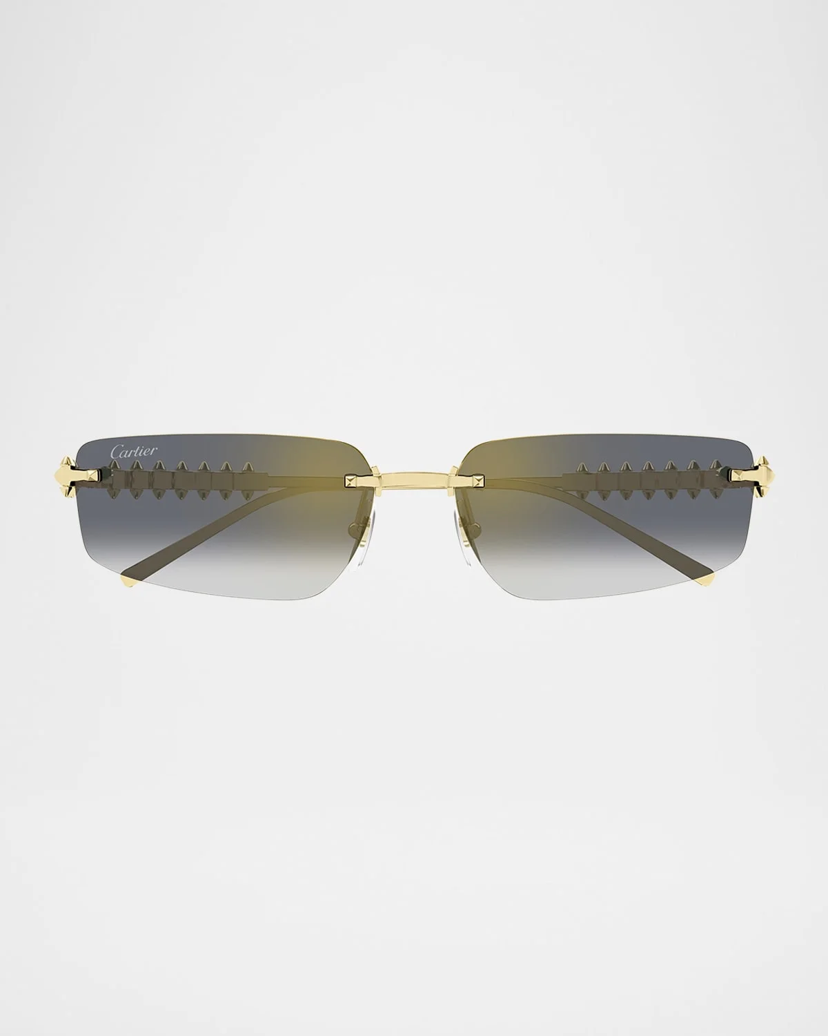 - Cartier "CT0544S" rectangle sunglasses in metal - Eye/bridge/temple (in mm): 58-16-140 - Rimless lenses; right logo script - Adjustable nose pads - Studding at temples - Thin, tapered arms - 100% UVA/UVB protection - Made in France - Proposition 65 warning for California residents