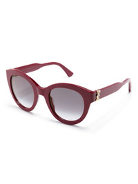 round-frame glasses Imagined in a deep shade of burgundy, these sunglasses sport Cartier's refined taste. They are crafted from acetate with an oversized rounded frame and are highlighted with a signature gold-tone Double C logo plaque at the sides. Highlights - Bordeaux red - Acetate - Round frame - Tinted lenses - Lens decal - Logo plaque at the arm - Straight arms - Curved tips - These glasses come with a protective case. Made in Italy Composition Outer: Acetate 100% SIZE & FIT Measurement Total Width 5.51 in(14 cm) Lens Diameter 1.85 in(4.7 cm) Bridge Width 0.7 in(1.8 cm) Arm Length 5.78 in(14.7 cm)