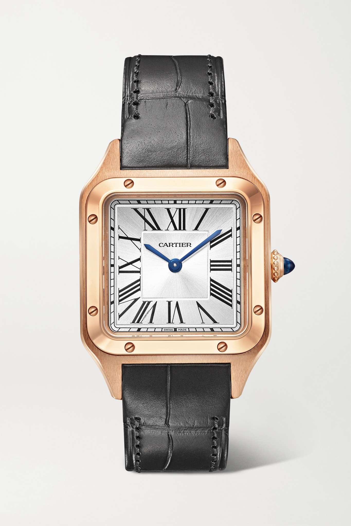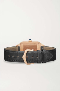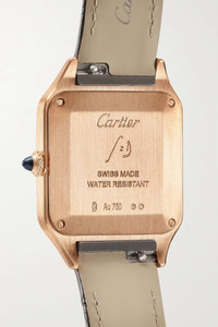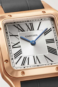 EDITORS'NOTES Cartier's 'Santos-Dumont' timepiece was first created in 1904 for Alberto Santos-Dumont, a Brazilian aviator - he wanted an alternative to the traditional pocket watch so that he could tell the time without taking his hands off the yoke mid-flight. Staying true to the original, this 38mm iteration has a squared 18-karat rose gold case bordered by eight screws and fastens with an elegant gray alligator strap. The slivered dial has with blued steel sword-shaped hands and easy-to-read Roman numerals, which are both house signatures.<br><br>All Cartier watches still within the initial 2-year warranty period under the original International Limited Warranty will be eligible to benefit from a 6-year extension, for a total of 8 years warranty. SIZE & FIT This item's measurements are: - Circumference: 19.5cm / 7.7in - Width: 3.5cm / 1.4in DETAILS & CARE - Movement - Quartz movement Functions - Hour and minute hands Dial - Silvered dial with sunray effect - Blued steel sword-shaped hands, black Roman numerals and markers Case - 18-karat rose gold case - Crown for time adjustments - Sapphire glass crystal - Engraved case back - Buckle-fastening gray alligator strap Specifications - Case diameter: 38mm; case thickness: 7.3mm - Water resistance: 3 bar - Comes in a presentation box - Alligator: USA - Reference number: WGSA0022 - Manufactured in Switzerland Cartier creations are manufactured with the greatest care by Cartier workshops in the purest tradition of jewelry and watchmaking, thus giving each piece a unique character. As a result, information on the carat weights in relation to a model may vary slightly from one piece to another and are therefore given for information only.