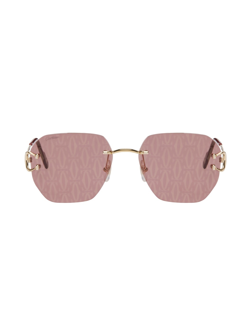 Square rimless metal-frame sunglasses in gold-tone. · Logo pattern printed at red lenses · Adjustable rubber nose pads · Logo hardware at red acetate temple tips · Hardside case included · Size: 40.17 145 Supplier color: Gold/Gold/Red