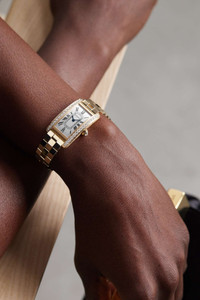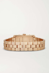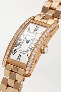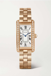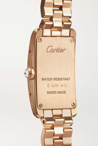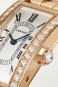 EDITORS'NOTES Inspired by the sleek contours of military vehicles, Cartier's 'Tank Américaine' watch is designed with a rectangular case that's become a "symbol of understated elegance'." This version is made from 18-karat rose gold and set with 0.96-carats of brilliant-cut diamonds along the bezel, which illuminate the silver satin-brushed dial. The Swiss-made quartz movement powers the blued-steel sword-shaped hands and the bracelet strap ensures it will remain a timeless heirloom for generations to come. For warranty information, please refer to details & care SIZE & FIT This item’s measurements are: - Circumference: 15cm / 5.9in DETAILS & CARE - Movement - Swiss-made quartz movement Functions - Hour and minute hands Dial - Silvered satin-brushed dial - Blued steel sword-shaped hands, black Roman numerals and markers Case - 18-karat rose gold case - Brilliant-cut F-G VVS-VVS2 diamonds, total weight: 0.96-carats - Crown for time adjustments - Sapphire glass crystal - Engraved case back - Rose gold strap Specifications - Case width: 35.4mm; case height: 19.4mm; case thickness: 6.8mm - Water resistance: 3 bar - Comes in a presentation box - Reference number: CRWJTA0044 Cartier creations are manufactured with the greatest care by Cartier workshops in the purest tradition of jewelry and watchmaking, thus giving each piece a unique character. As a result, information on the carat weights in relation to a model may vary slightly from one piece to another and are therefore given for information only All Cartier watches still within the initial 2-year warranty period under the original International Limited Warranty will be eligible to benefit from a 6-year extension, for a total of 8 years warranty.