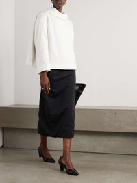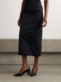 For Fall '24, Creative Director Louise Trotter continues to redefine Carven's identity through fresh designs that are sophisticated yet entirely wearable. This skirt is made from black satin and topped with a sporty, elasticated waistband. It has a column shape and split hem. Wear yours from the office to dinner afterward. Size & Fit - Fits true to size, however those who are between sizes should take the smaller size - Midi-length, designed to be worn just below the natural waist - Elasticated at the waist for a comfortable fit - Mid-weight, structured, non-stretchy fabric - Model is 177cm/ 5'10" and is wearing a FR 34 Model measurements: - Bust: 79cm/ 31" - Waist: 61cm/ 24" - Hip: 89cm/ 35" Details & Care - Black satin - Concealed hook and zip fastening at back - 72% polyester, 28% silk - Dry clean