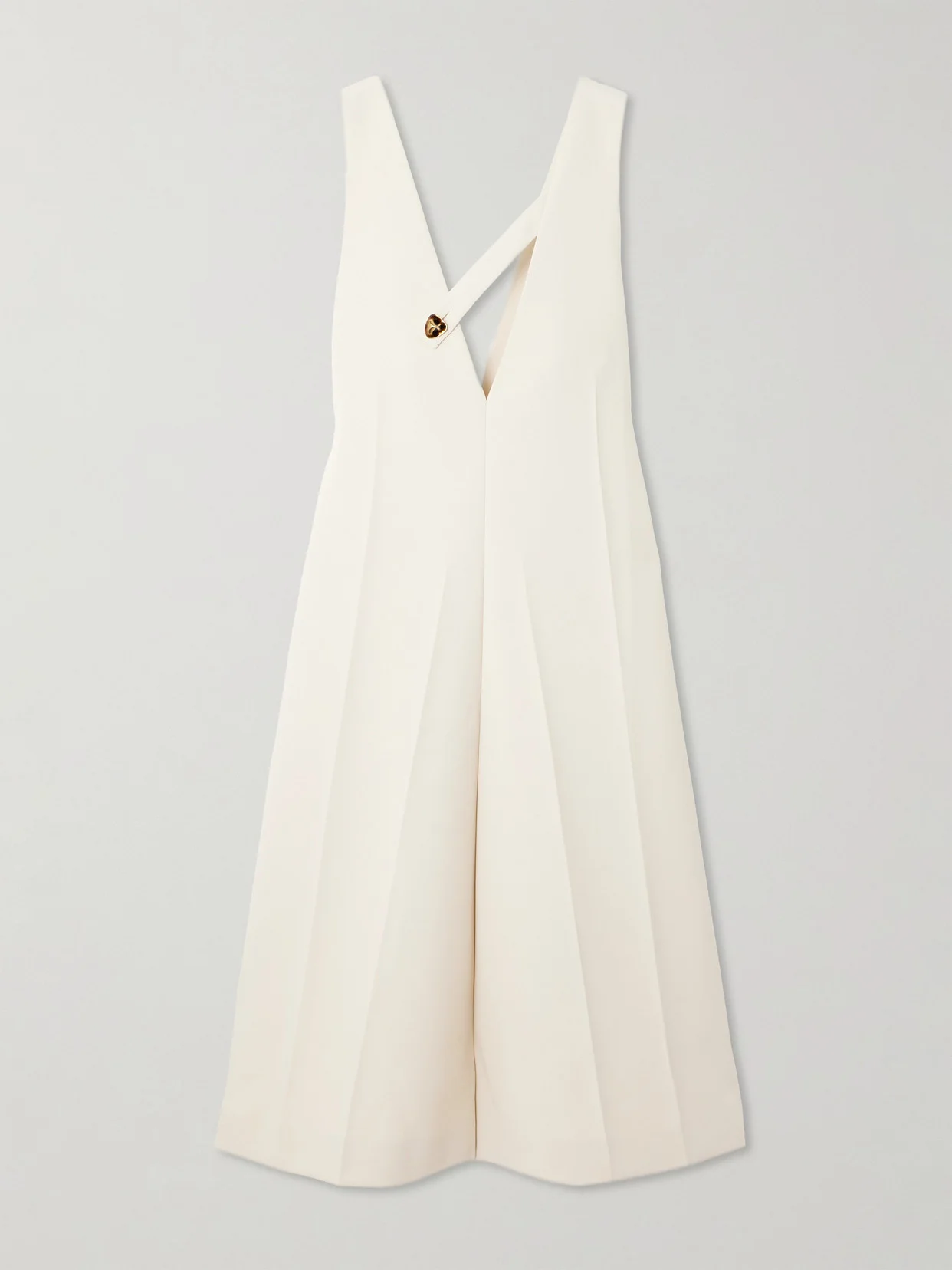 Carven's dress is so sophisticated and cool. Made from wool-blend, it has a plunging V-neck tempered by a single strap at the front. The sharply pressed creases and inverted front pleat gives the skirt such nice volume. Match your jewelry to the gold-tone button.