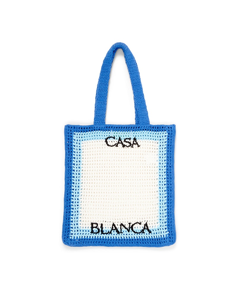 Cotton Atlantis Handbag by Casablanca, double soft crochet handles at top, crochet design, single interior compartment, iconic brand monogram embroidered in contrasting front and back, multicolor pattern. DETAILS sku AS23BAG01104_BLUE composition : COTTON 100 color : BLUE gender : WOMAN season : SS23 size chart : WOMAN UNI category name : HANDBAGS