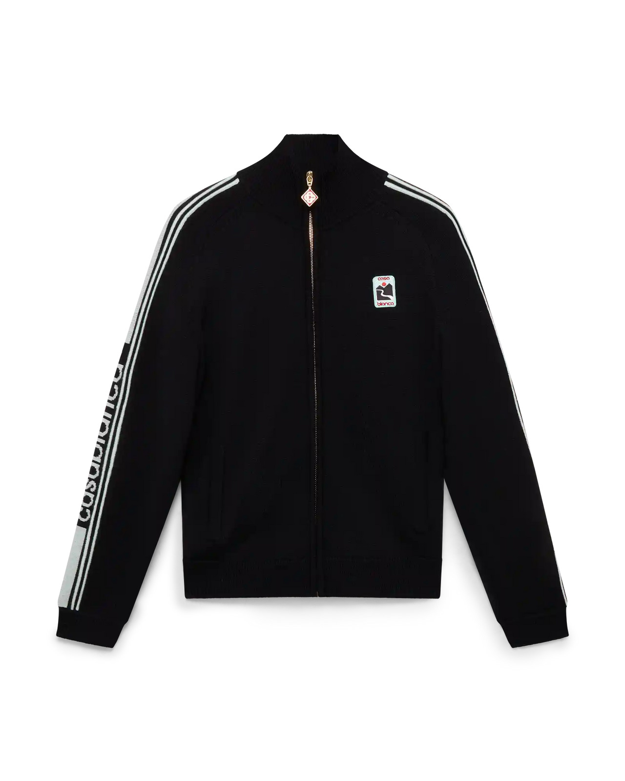 The merino knit track jacket is a long-sleeve knitted design crafted from merino wool fabric. Completed with ribbed detail on the cuffs and hem, a contrast placket, a funnel collar, front zip closure, stripe details down the sleeves, and the Casablanca logo. - Merino wool fabric - Main: 100% merino wool - Embroidery: 100% polyester - Colour: black - Specialised dry clean only - Made in China - Slim fit - The model is 177cm/5'9.5 and is wearing a size S