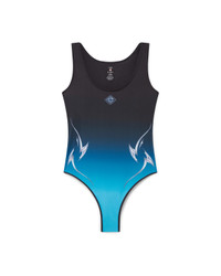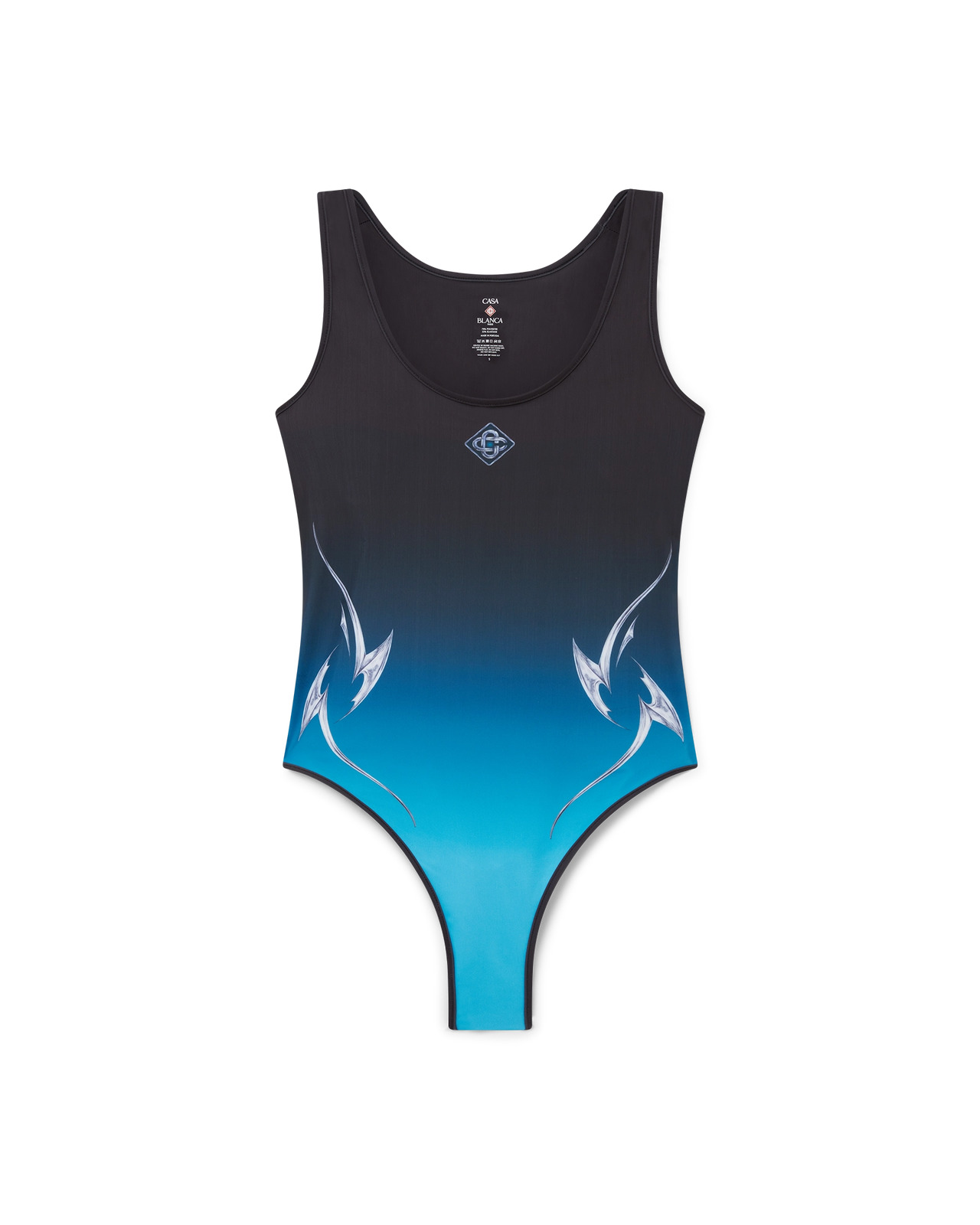 The Blades swimsuit is a printed design crafted from a breathable technical swim fabric, featuring artwork that play with the contrast between two opposing feelings - the sharpness of the blade and the cold, silver chrome, contrasted with the warmth of nature, like the bold pink and red tones of an orchid flower. The addition of water brings a fresh, crisp element to the design. Completed with high-cut legs, a scoop neck, a cut-out back, and the house's signature diamond logo on the chest. - Technical swim fabric - 100% polyester - Colour: black/blue gradient - Delicate machine wash - Made in Portugal - Slim fit - The model is 179cm/5'9.5 and is wearing a size S