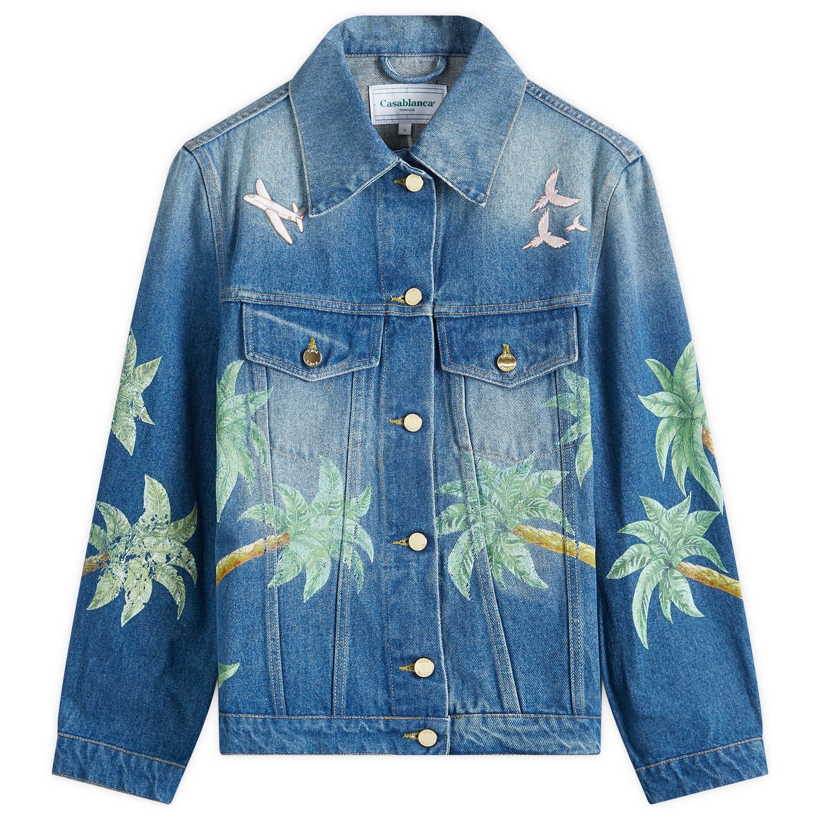 With bright, vivacious colours and refined yet relaxed designs, Casablanca captures the essence of modern resort-lux, offering a perfect equilibrium of luxury and leisurewear. This washed denim jacket evokes all the joy of travel, decorated with vibrant palm trees, birds, animals and flags throughout. Expertly crafted in Portugal, Tennis Club embroidery spans across the back, exuding that exclusive ’if you know, you know’ energy. - 100% Cotton - Printed Graphics - Classic Collar - Button Closure - Chest Flap Pockets - Embroidered Branding - Made in Portugal