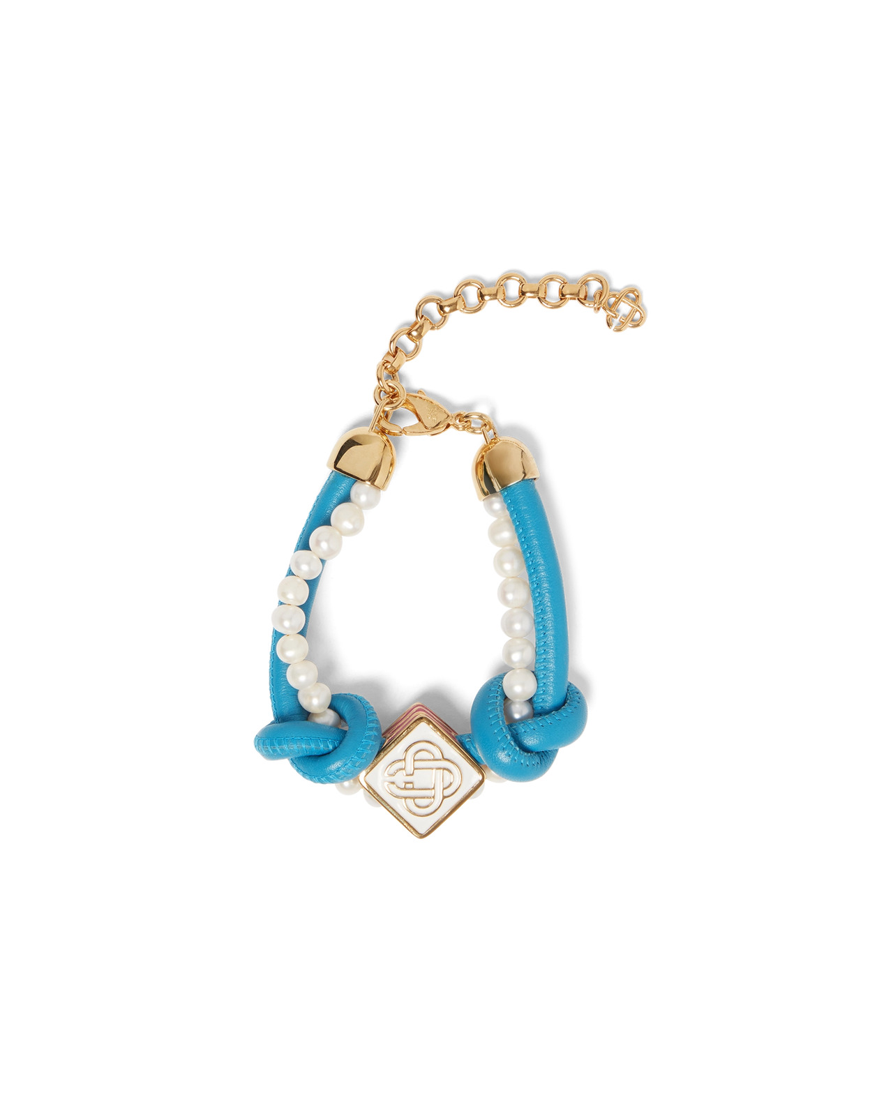 The blue knotted pearl bracelet is crafted from leather and freshwater pearls and features the house's signature diamond logo. Completed with gold-plated lobster clasp and chain. - Leather and pearl - Gold-plated brass/enamel/real freshwater pearls - Colour: blue and white - Clean with a soft, dry cloth - Includes a gift box, a branded dust bag and a product detail booklet - Estimated to ship on 19 February 2025