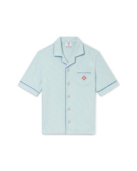 The monogram towelling shirt is a short-sleeve design crafted from a monogram cotton blend towelling fabric and features the house's signature diamond logo. Completed with a breast pocket, contrast piping, gold rim pearl buttons and a Cuban collar. - Monogram towelling fabric - Main: 86% cotton 13% polyamide 1% elastane - Contrast: 100% polyester - Applique: 95% viscose 5% polyester - Colour: light blue - Made in Portugal - Fits true to size, take your regular size - The model is 186cm/6'1 and is wearing a size M