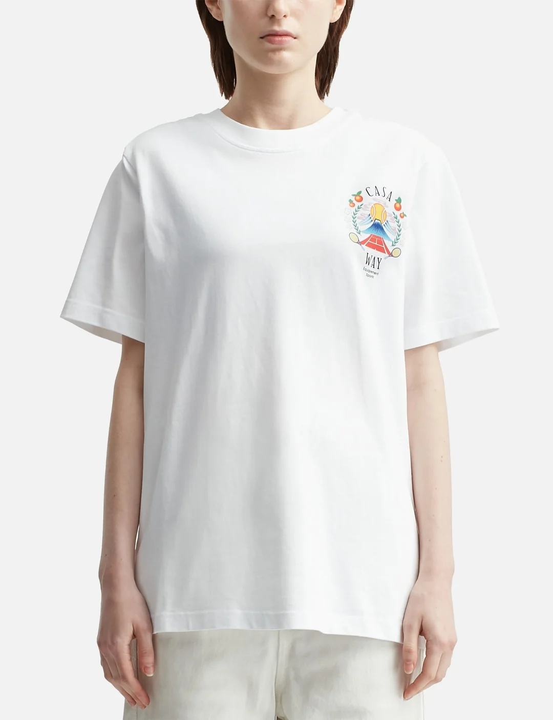 - Casablanca - Casa Way Mountain T-Shirt - Made of organic cotton - Ribbed crewneck - Short sleeve - Graphic print at chest and back - Made in Portugal - Color: White - Material: 100% Orangic Cotton - See more SS T-Shirts, T-Shirts and Clothing - Model wears size M - Model measures: Height 186cm, Chest 34”/86cm, Waist 28”/71cm, Hip 36”/91cm - Vendor Code: MPF25-JTS-001-08