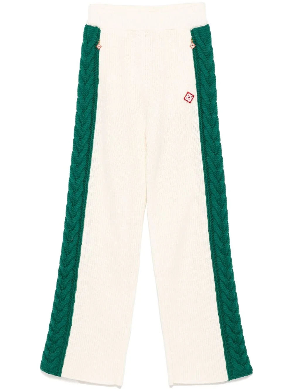 cable-knit trousers Highlights - White - Elasticated waistband - Two side zip-fastening pockets - Logo patch to the front Imported Composition Wool 70%, Cashmere 30% SIZE & FIT Model measurements Height 5 ft 10 in(1.78 m) Bust/Chest 32.67 in(83 cm) Hips 37 in(94 cm) Waist 25.59 in(65 cm) FittingInformation Designed with a flared hem, these trousers allow for a close fit at the waist with a slim fit over the leg and widening towards the hem The elasticated waist allows for a comfortable fit Made from a heavyweight non-stretch fabric, this piece offers minimal elasticity when worn