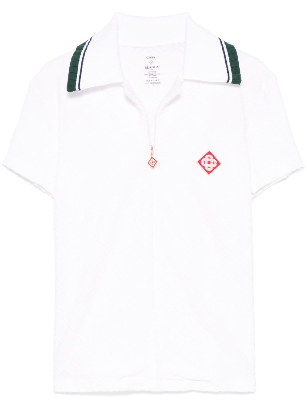 ribbed-collar shirt Highlights - White - Front zip fastening - Short sleeves - Logo patch at the chest - Monogram pattern Imported Composition Polyamide 96%, Elastane 4% SIZE & FIT Model measurements Height 5 ft 9 in(1.76 m) Bust/Chest 31.1 in(79 cm) Hips 36.61 in(93 cm) Waist 24.8 in(63 cm) FittingInformation Designed for a relaxed fit, this piece allows for comfort and movement when worn The dart stitching adds structure and a closer fit in the torso of this piece Made from a midweight stretch fabric, this piece offers elasticity and flexibility when worn Measurement SLEEVE LENGTH 5.98 in(15.2 cm) LENGTH 20.51 in(52.1 cm) WAIST 30 in(76.2 cm) BUST 32 in(81.3 cm) Washing instructions Hand Wash