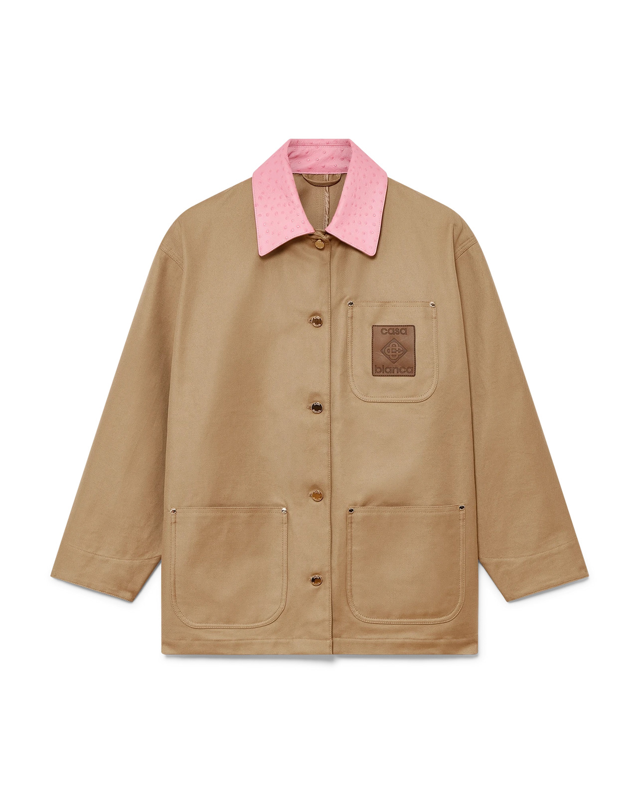The cotton workwear jacket is a long-sleeve relaxed, laid-back design crafted from cotton drill fabric. Completed with contrast collar, a breast pocket with a branded leather patch, front patch pockets, button closure, and gold-plated hardware. - Cotton drill fabric - Main: 100% cotton - Lining: 100% viscose - Colour: beige - Specialised dry clean only - Made in Portugal - The model is 177cm/5'9.5 and is wearing a size S