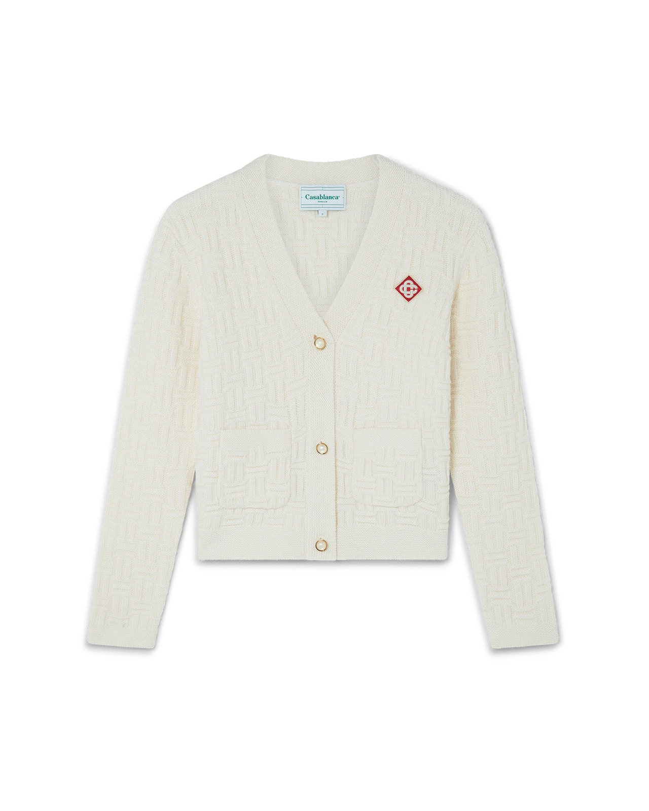 The column knit cardigan is a long-sleeved woven design inspired by ancient Greece, crafted from a soft luxurious merino wool fabric. Completed with the house's diamond logo, button closure, patch pockets, signature gold rim pearl buttons, and a plain knitted placket, cuffs, hem and pocket detail. Merino wool fabric 98% merino wool 1% polyamide 1% elastane Applique: 95% rayon 5% polyester Colour: white Specialised dry clean only