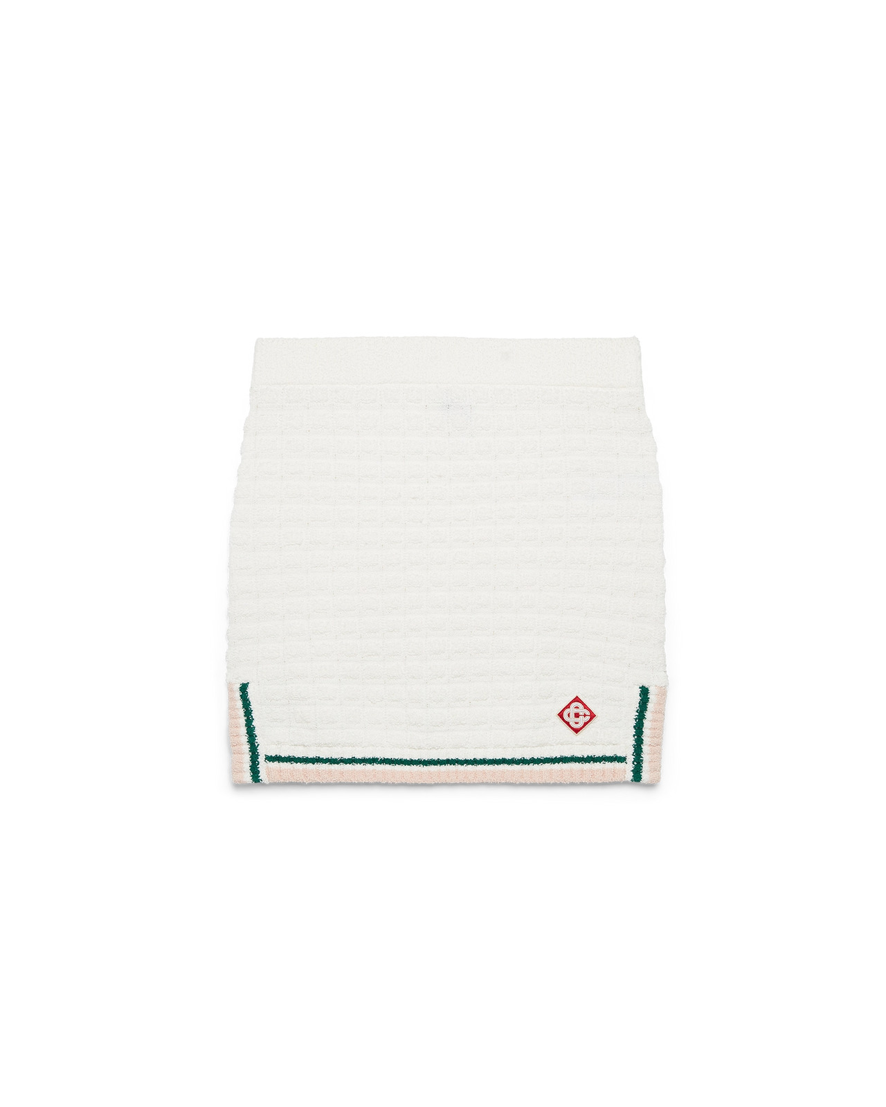 The cotton boucle mini skirt is a knitted design crafted from cotton boucle fabric featuring the house's signature diamond logo. Completed with an elasticised waistband, a rib hem and side slits with pink, white and green stripe detail. - Cotton boucle fabric - Main: 79% cotton 20% nylon 1% elastane - Colour: white - Specialised dry clean only - Made in China - Slim fit - The model is 177cm/5'9.5 and is wearing a size S