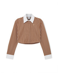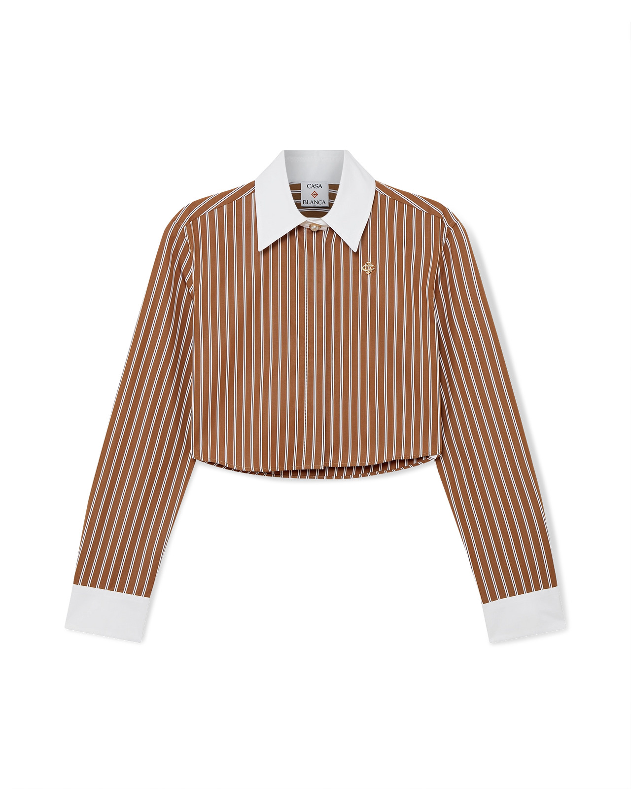 The stripe cropped long-sleeve shirt is a short style crafted from a cotton barré fabric. Completed with button closure, interlocking CC logo corozo buttons, signature gold rim pearl button at the collar, contrast white point collar and cuffs and a curved hem. - Cotton barré fabric - 100% cotton - Colour: brown - Specialised dry clean only - Made in Italy - The model is 177cm/5'9.5 and is wearing a size S