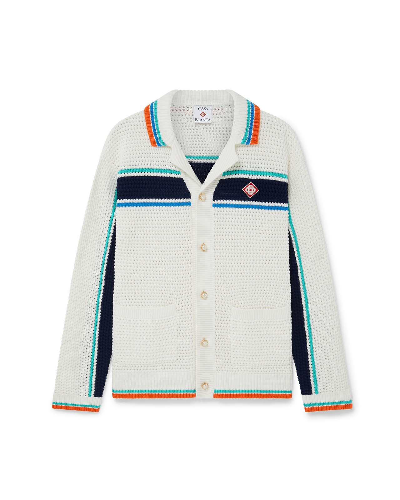 The crochet tennis shacket is a long-sleeved textured design crafted from a crochet organic cotton fabric and features the house's signature diamond logo tying back to the capsule’s travel and vacation theme. Completed with a rib collar, cuffs, hem and placket, front patch pockets, signature gold rim pearl buttons, front button closure, and aqua, blue and white stripe detail across the chest, back, and down the sleeves, with contrast edge detail on the cuffs, hem and collar. - Crochet effect cotton fabric - 100% cotton - Gradient wave multicolour - Specialised dry clean only - The model is 179cm/5'10.5 and is wearing a size S - Exclusive to casablancaparis.com and selected retailers