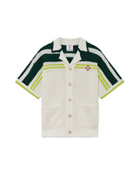 The crochet sporty shirt is a short-sleeve knitted design crafted from crochet cotton fabric and features the house's signature diamond logo. Completed with signature gold rim pearl buttons, stripe details on the shoulders and down the sleeves, front patch pockets, and striped edge detail on the collar, and cuffs. - Crochet cotton fabric - Main: 100% cotton - Trim: 95% viscose 5% polyester - Colour: green/white - Specialised dry clean only - The model is 179cm/5'10.5 and is wearing a size S - Exclusive to casablancaparis.com