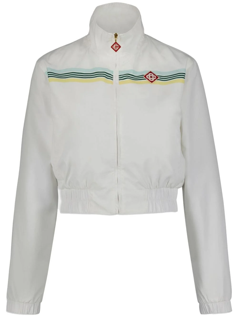 crochet-trim zip-up track jacket Highlights - White - Crochet trim - Scallop edge - High neck - Branded zip puller - Front zip fastening - Long sleeves with elasticated cuffs - Two side welt pockets - Elasticated hem Imported Composition Polyester 100% Washing instructions Read Manufacturer Guidelines