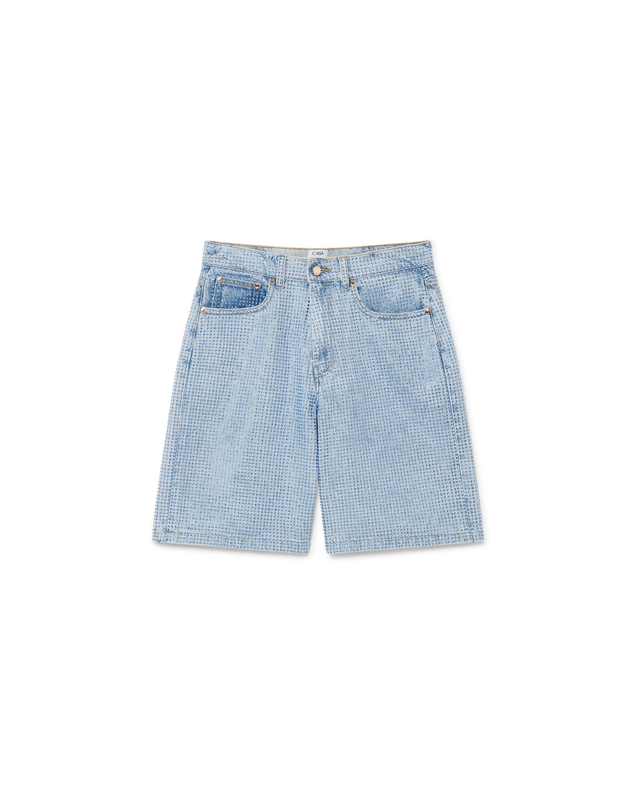 The crystal embellished denim shorts are a knee-length design with a relaxed silhouette crafted from denim fabric and glass beading. Completed with a lining, front and back pockets, zip closure, and belt loops. - Embellished denim fabric - Main: 100% cotton - Lining: 50% cotton 50% polyester - Colour: mid-wash blue - Specialised dry clean only - Made in Portugal - The model is 180cm/5'11 and is wearing a size S