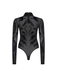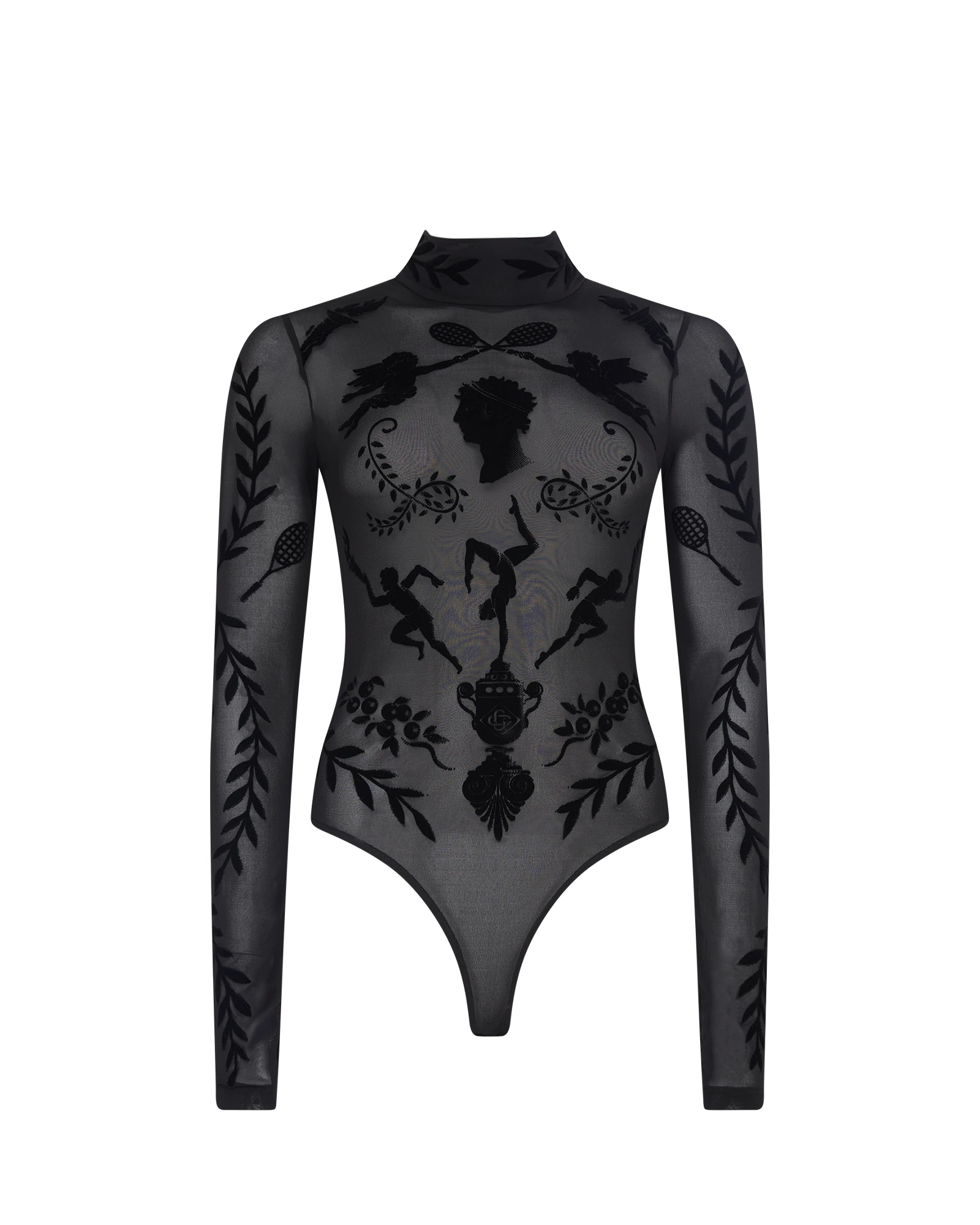 The devore bodysuit is a one-piece form-fitting long-sleeve printed design crafted from a poly blend Devore fabric. Completed with a polo neck, high-cut legs, and snap button closure. This piece fits beautifully with tailored trousers. Devore fabric 72% viscose 28% polyester Colour: black Specialised dry clean only Made in Portugal Fit true to size, take your regular size