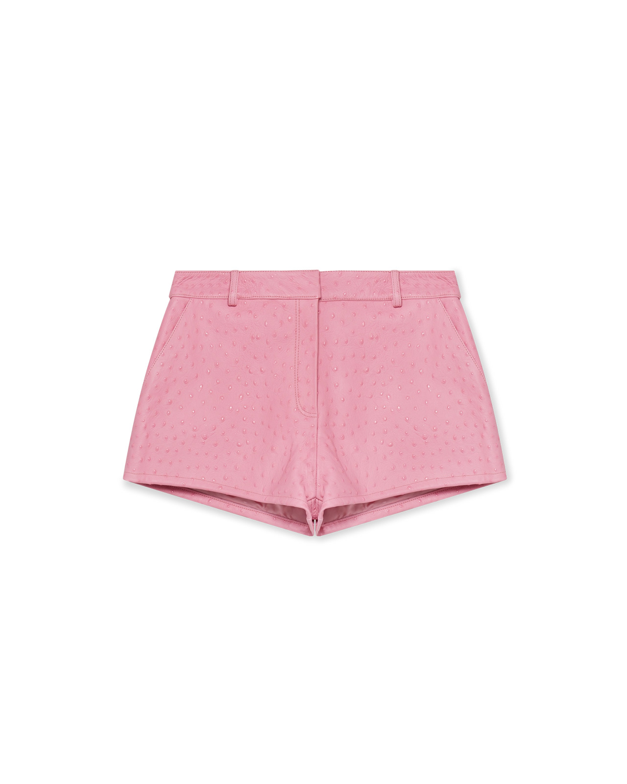 The embossed leather mini shorts are a short style crafted from embossed leather and features an ostrich-effect print. Completed with zip closure, faux flap pockets, and a zip closure. - Embossed leather - Main: 100% calf leather - Lining: 100% viscose - Colour: pink - Specialised dry clean only - Made in Italy - The model is 177cm/5'9.5 and is wearing a size S