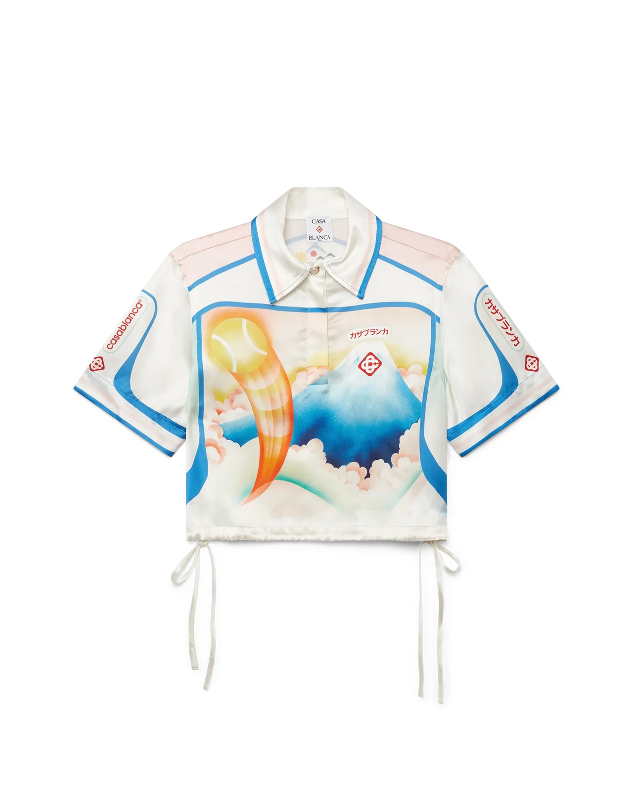 The Fuji Dream satin cropped shirt is a short-sleeve printed design featuring artwork that showcases a dream-like vision of a trip to Mount Fuji - crafted from satin fabric. Completed with a point collar, button closure, interlocking CC logo corozo buttons, and string fastenings at the sides. - Printed satin fabric - 100% viscose - Fuji Dream print multicolour - Specialised dry clean only - Made in Italy - Relaxed fit - The model is 177cm/5'9.5 and is wearing a size S