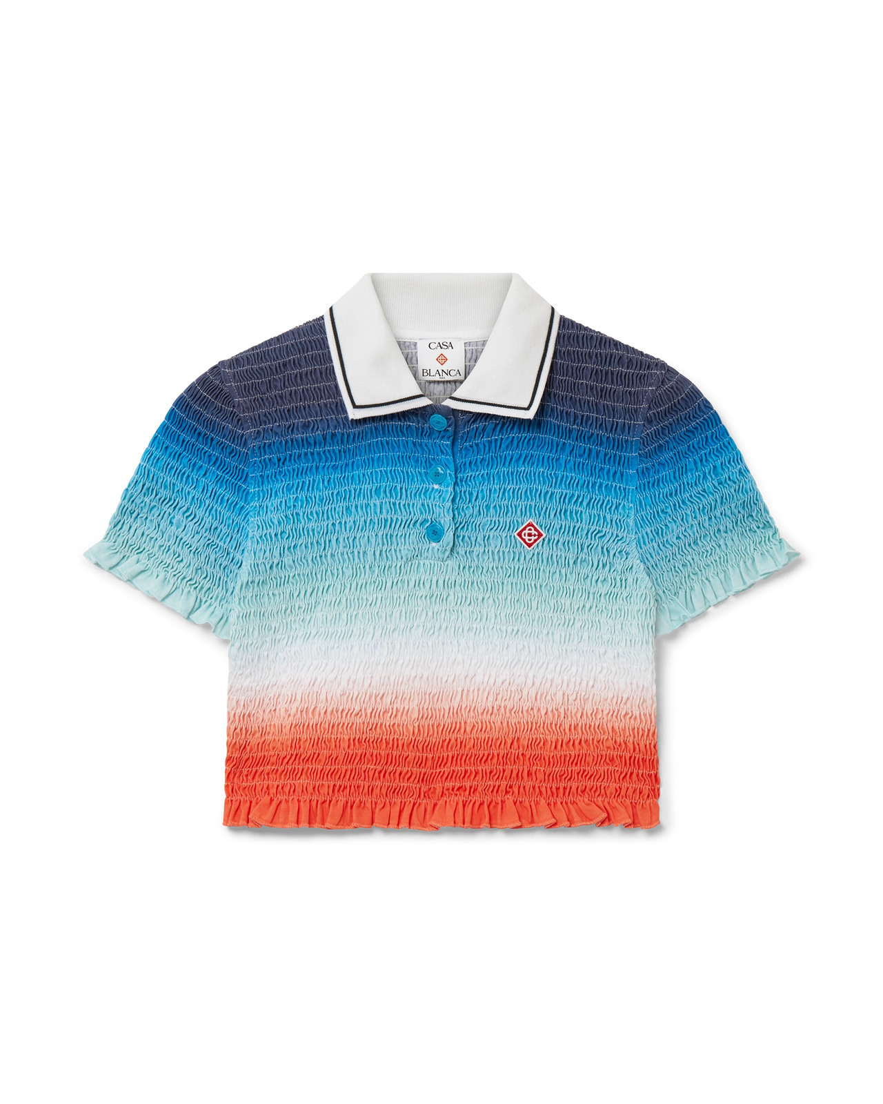 The gradient cropped polo shirt is an all-over printed short style featuring the house's seasonal vibrant gradient print of deep inky blues transitioning through shades of pink to vibrant orange, representing the summer’s shifting sky, sinking into the ocean’s horizon, alluding to nature’s ever-changing canvas, and the house's signature diamond logo. Crafted from shirred cotton fabric and completed with a contrast collar with edge detail, three-button placket closure, short sleeves, and frill details on the cuffs and hem. Designed to fit above the navel. - Gradient shirred cotton fabric - Main: 100% cotton - Contrast: 95% cotton 5% polyester - Gradient multicolour print - Specialised dry clean only - Made in Portugal - The model is 177cm/5'9.5 and is wearing a size S - Exclusive to casablancaparis.com and selected retailers
