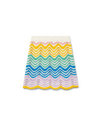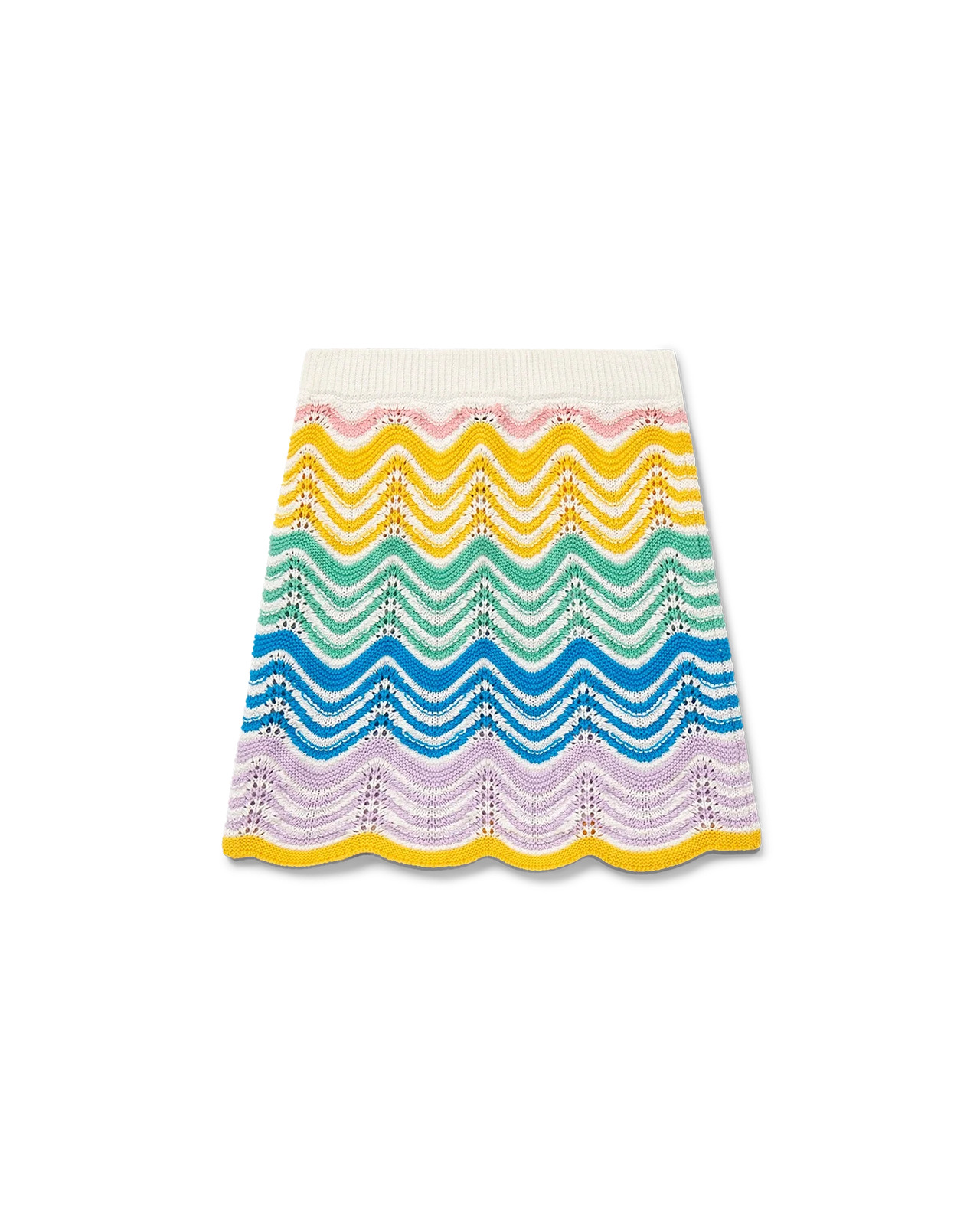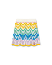 The Gradient Wave crochet skirt is a short style and Casablanca's classic design, crafted from a crochet cotton fabric featuring the house's wave pattern in this season's pastel colours. Completed with the house's signature diamond logo, contrast white rib waistband with blue edge detail. Crochet cotton fabric 100% organic cotton Pastel gradient multicolour Specialised dry clean only Fits true to size, take your regular size The model is 177cm/5’10 and is wearing a size S