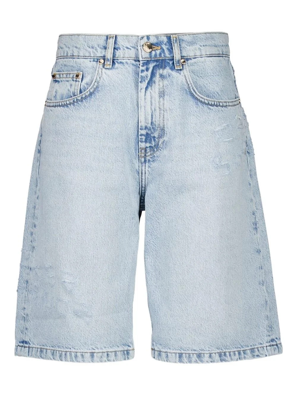 distressed denim shorts Highlights - Light blue - Frayed hem - Five-pocket design - Subtle fading - Rear logo patch Imported Composition Cotton 100%