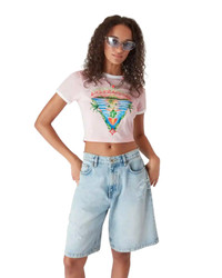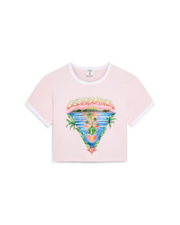 The Innocence Triangle baby tee features an ocean scene at sunset with an island in the centre, rendered in a style influenced by classic surf t-shirt art. The artwork captures the golden hour's ethereal beauty over tropical waters, presenting an idealised vision of beach paradise through the house's refined sport-leisure lens. Completed with a classic crew neck, short sleeves, and a slim fit that embodies the house's refined approach to casualwear. - Printed cotton fabric - 95% cotton 5% elastane - Colour: pink - Delicate machine wash - Made in Portugal - Slim fit - The model is 177cm / 5'9 and is wearing size S - Exclusive to casablancaparis.com and our Paris and LA flagship stores